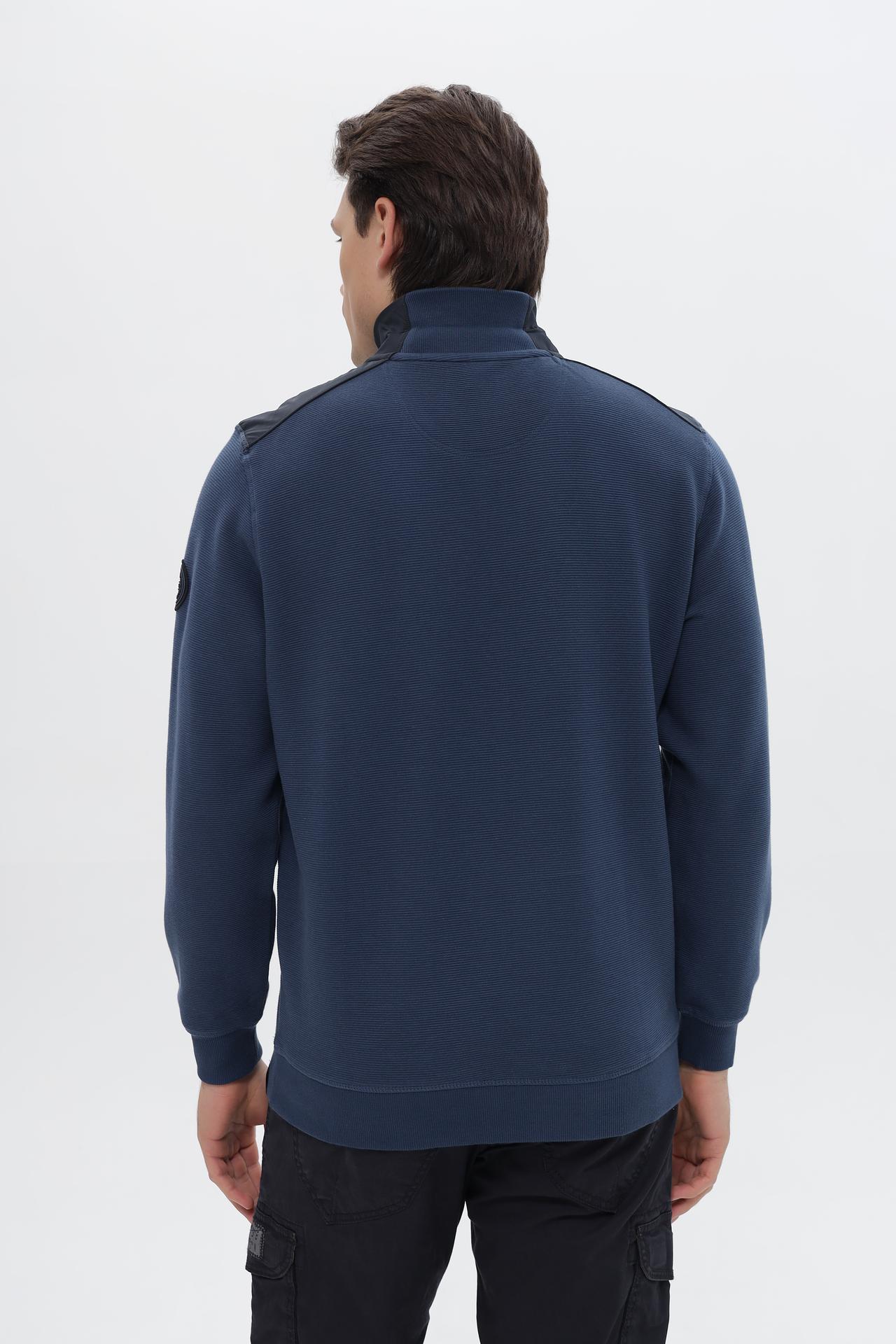 - Дизайн: Джемпер выполнен в классическом синем цвете с воротником-стойкой и застежкой-молнией. Декоративные элементы из контрастной ткани на плечах и небольшой патч с логотипом бренда добавляют изделию индивидуальности.