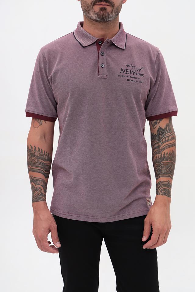 На груди расположена яркая графика с надписью "New York", что придает поло индивидуальность. Горловина и рукава отделаны темной бордовой полосой, создавая контрастный эффект.