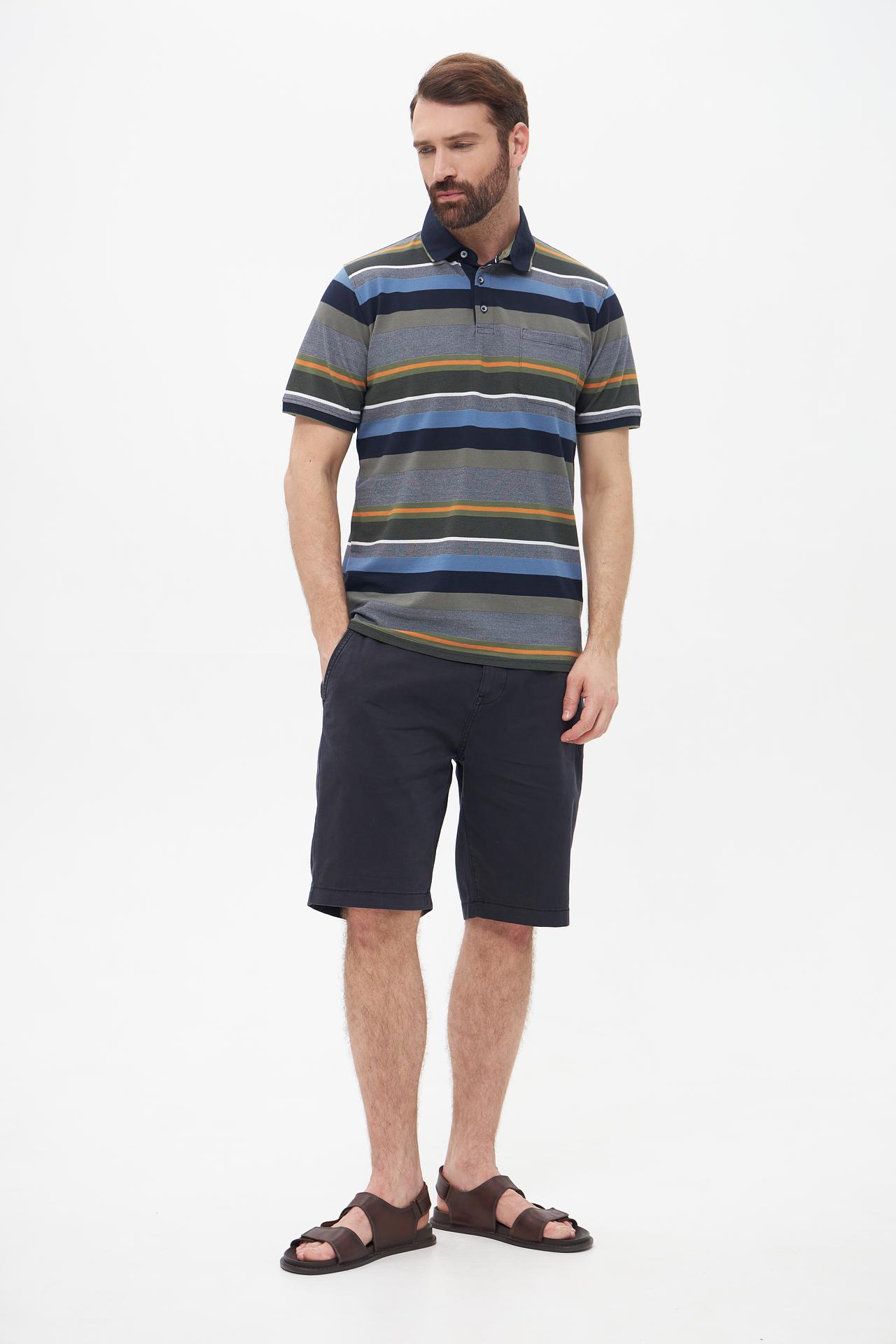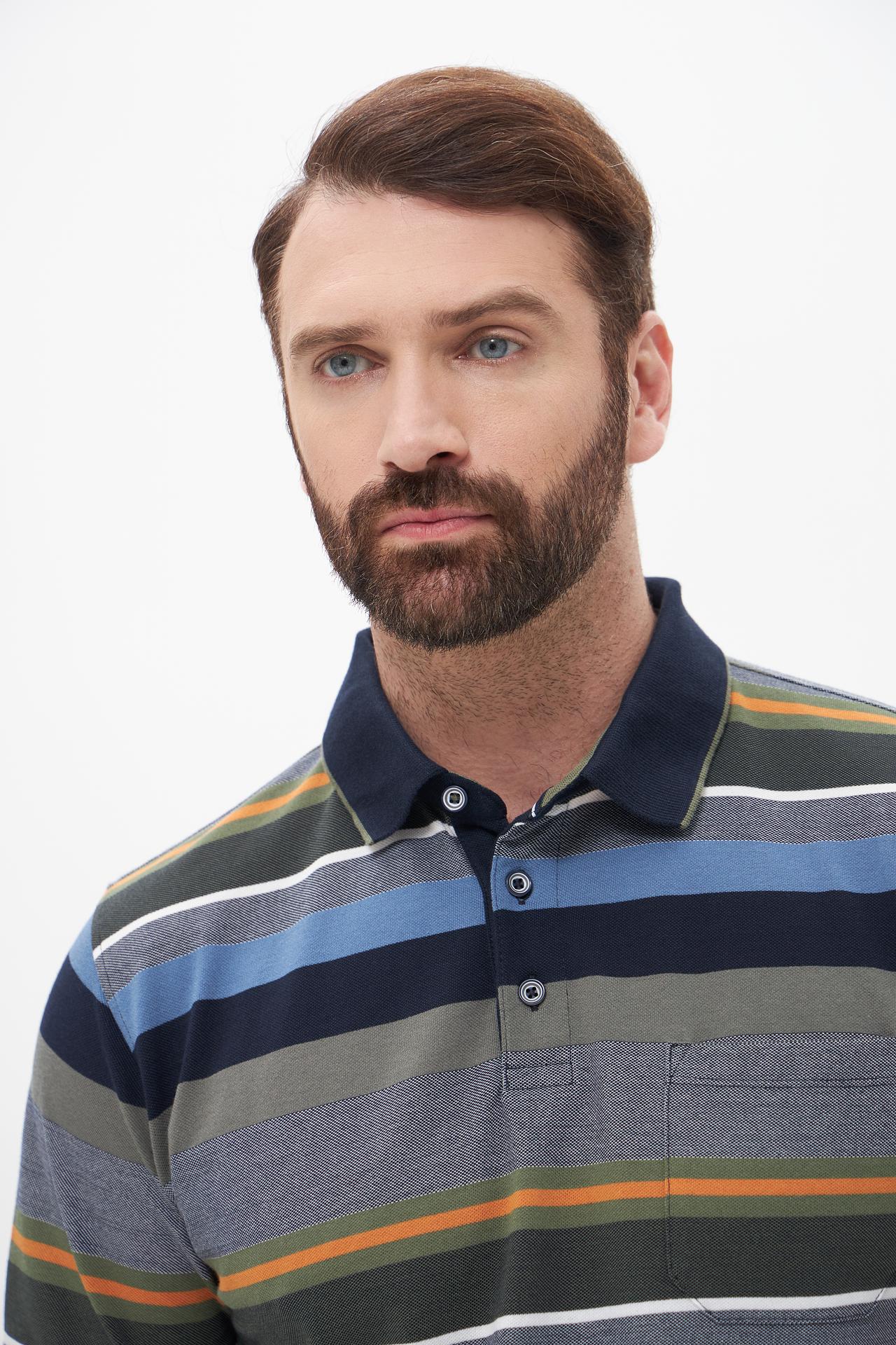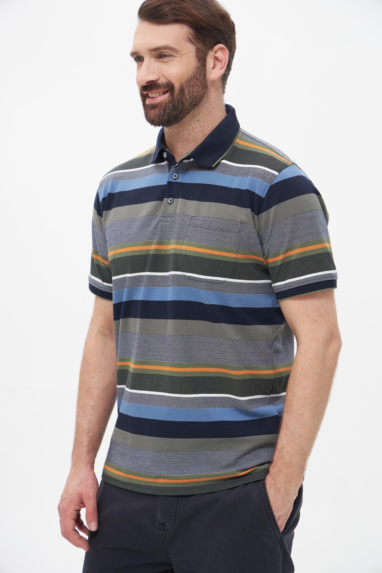 Стильное поло от Casa Moda в классическую полоску, которое станет универсальным дополнением к вашему повседневному гардеробу. Дизайн в полоску, сочетающий оттенки серого, синего, зеленого и оранжевого, придает изделию динамичность и современный вид. Воротник-поло и планка с пуговицами создают элегантный силуэт, а нагрудный карман добавляет практичности.