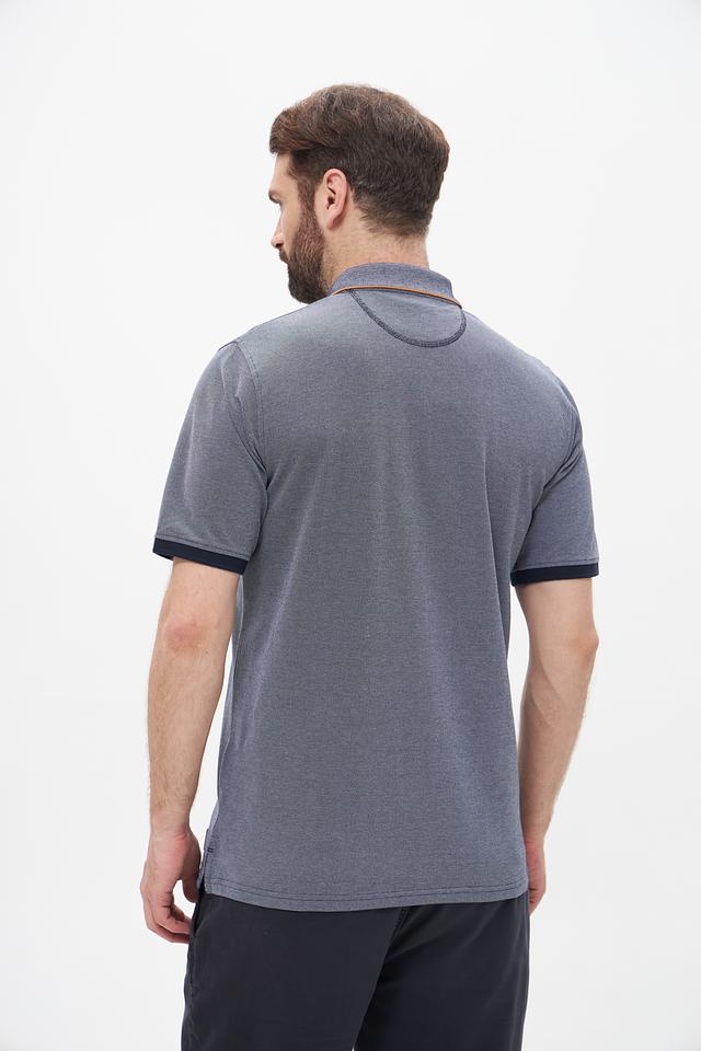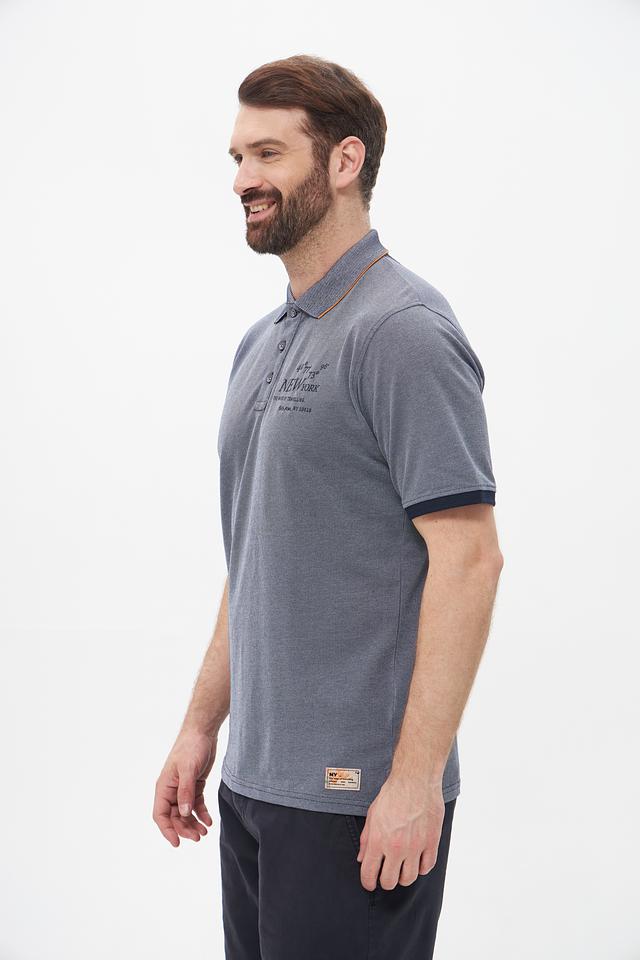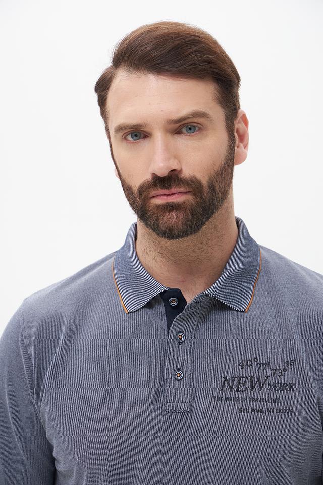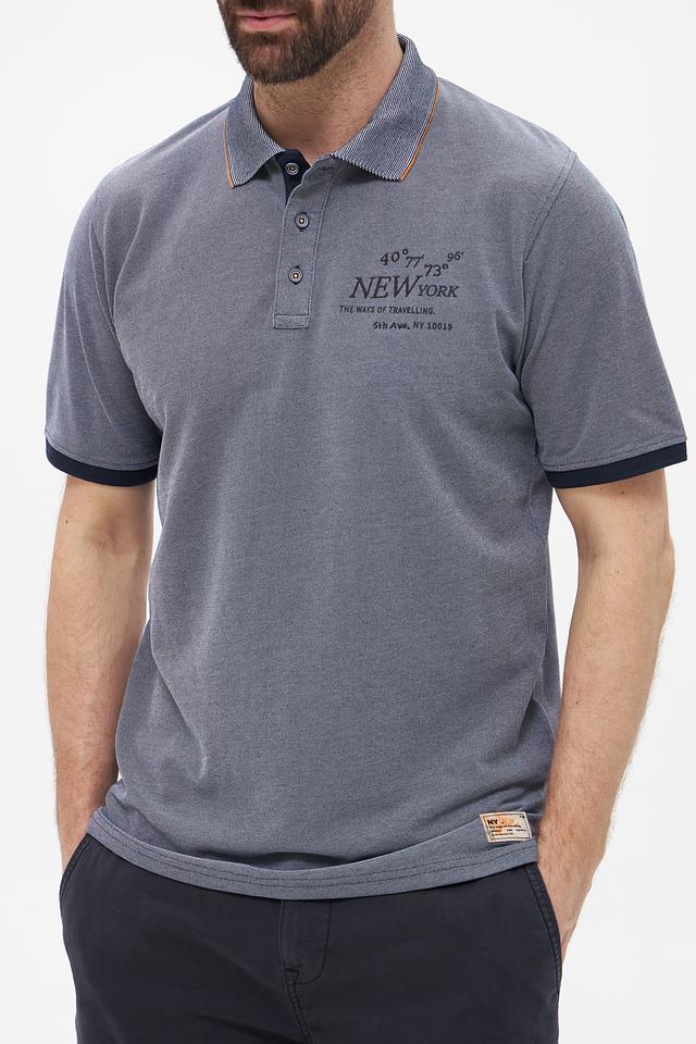 Мужское поло от Casa Moda выполнено в сером цвете с эффектным принтом "New York" на груди. Воротник и манжеты оформлены тёмно-синей полосой, что добавляет контрастности и стиля.