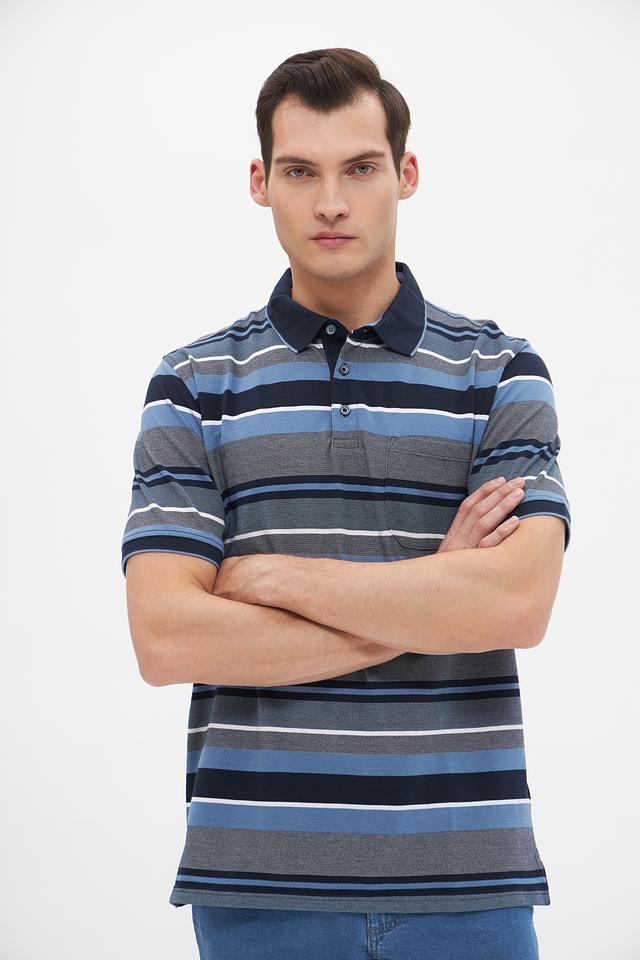 Мужское поло Casa Moda синего цвета с классическим дизайном в полоску. Изготовлено из сочетания хлопка и полиэстера, обеспечивающего комфорт и практичность. Состав: полиэстер 50%, хлопок 50%