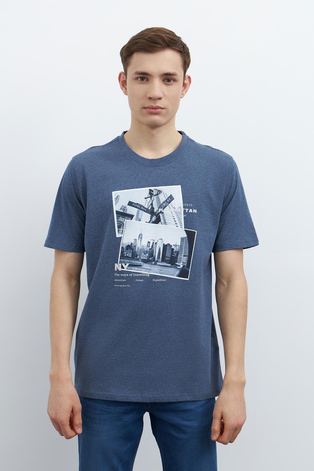 Модель синего меланжевого цвета украшена оригинальным графическим принтом, который придает изделию современный и динамичный вид. Принт включает изображения городских пейзажей и надписи, подчеркивающие дух путешествий и свободы. Универсальный круглый вырез и стандартный крой делают эту футболку легко сочетаемой с различными элементами гардероба.