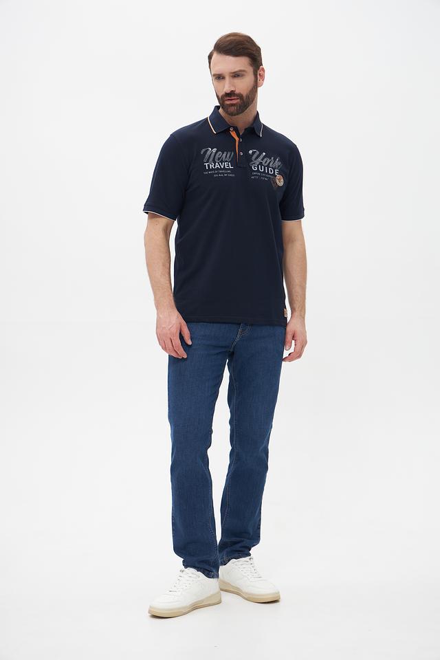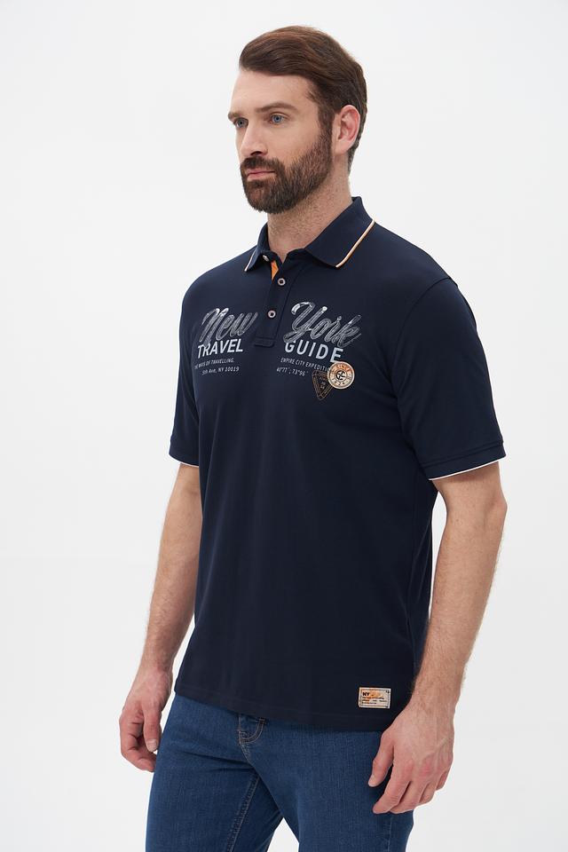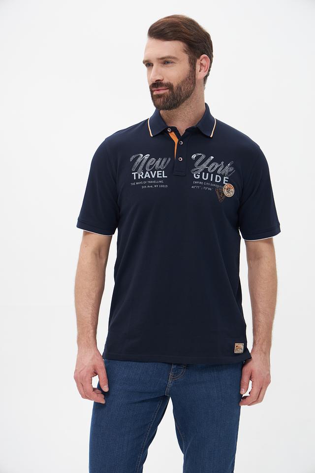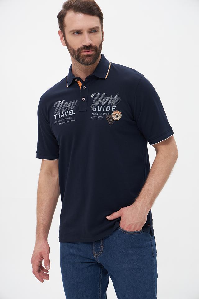 Мужское поло Casa Moda темно-синего цвета с ярким принтом "New York Travel". Изготовлено из мягкого хлопка с добавлением эластана для комфорта и сохранения формы. Стильный и удобный выбор для повседневной носки. Состав: хлопок 95%, эластан 5%