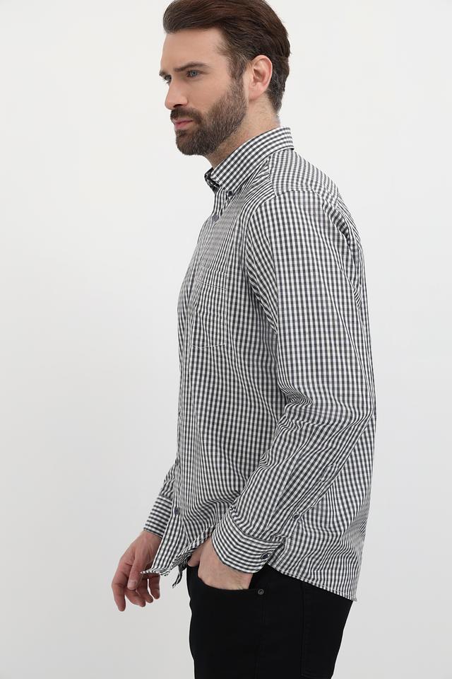 Основной цвет рубашки – белый, дополненный графичным чёрным рисунком в клетку. Это сочетание делает рубашку универсальной и легко сочетаемой с различными элементами гардероба. Рубашка выполнена из 100% хлопка, что обеспечивает приятные тактильные ощущения и хорошую воздухопроницаемость.