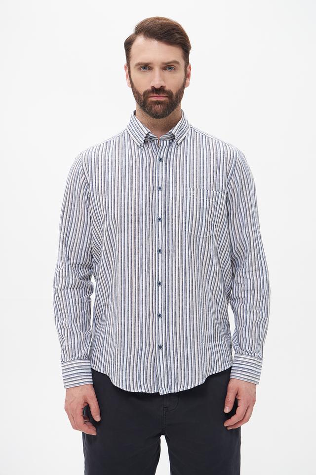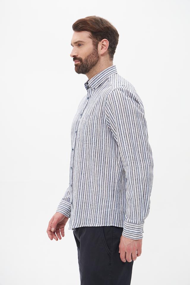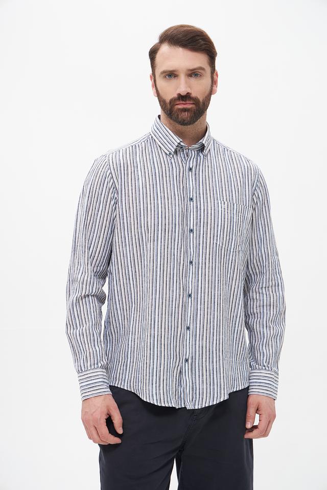 Основной цвет рубашки – белый, но она украшена вертикальными полосами синего оттенка, что придает ей свежий и современный вид. Рукава рубашки имеют манжеты на пуговицах, которые можно застегнуть или оставить расстегнутыми для создания более расслабленного образа.