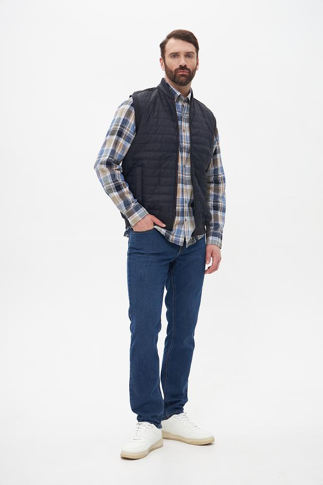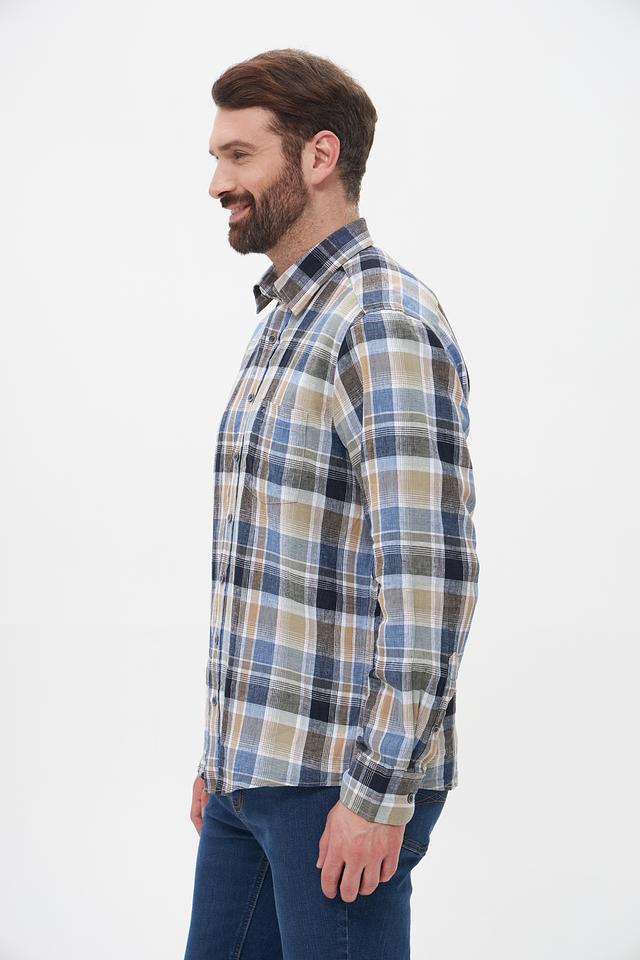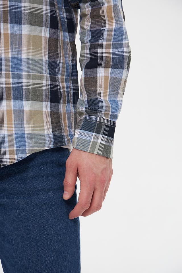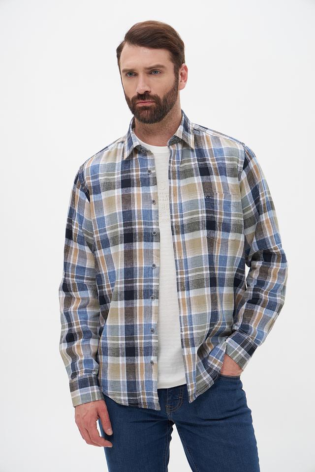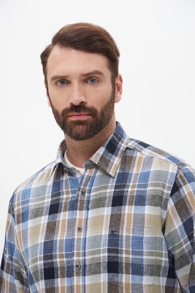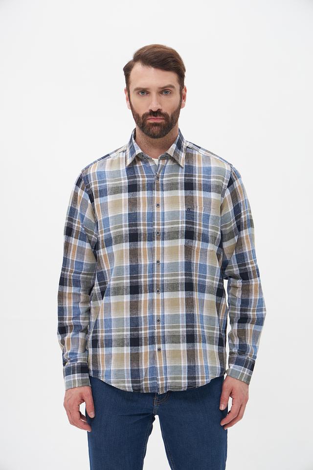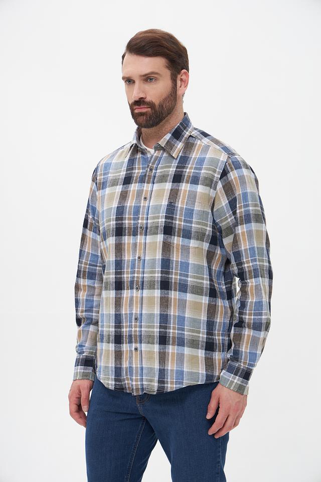 Мужская рубашка Casa Moda голубо-бежевого цвета в классическую клетку. Изготовлена из натурального смесового материала, обеспечивающего комфорт и воздухопроницаемость. Отличный выбор для создания повседневного образа. Состав: лен 55%, хлопок 45%