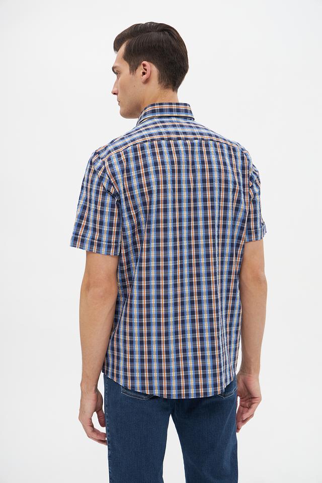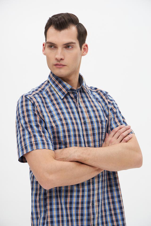 Рубашка имеет классический крой, короткие рукава и традиционный воротник. Особенностью данной модели является яркий клетчатый принт, сочетающий в себе оттенки синего, горчичного и белого. Такой рисунок добавит образу динамичности и индивидуальности.