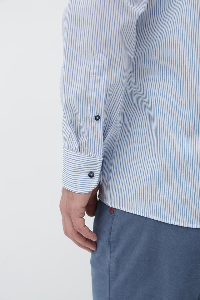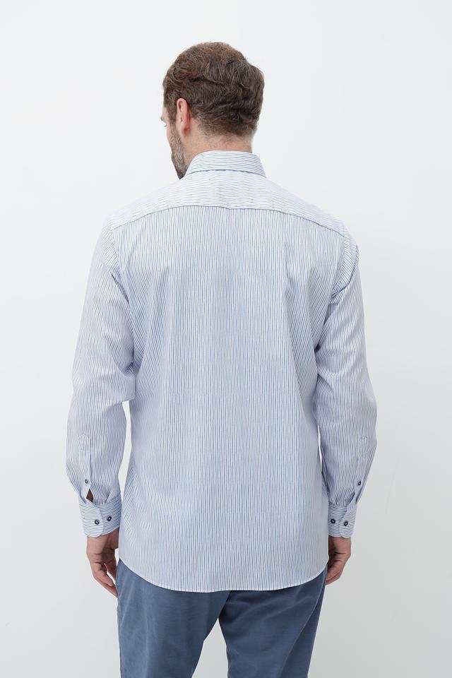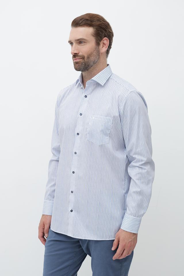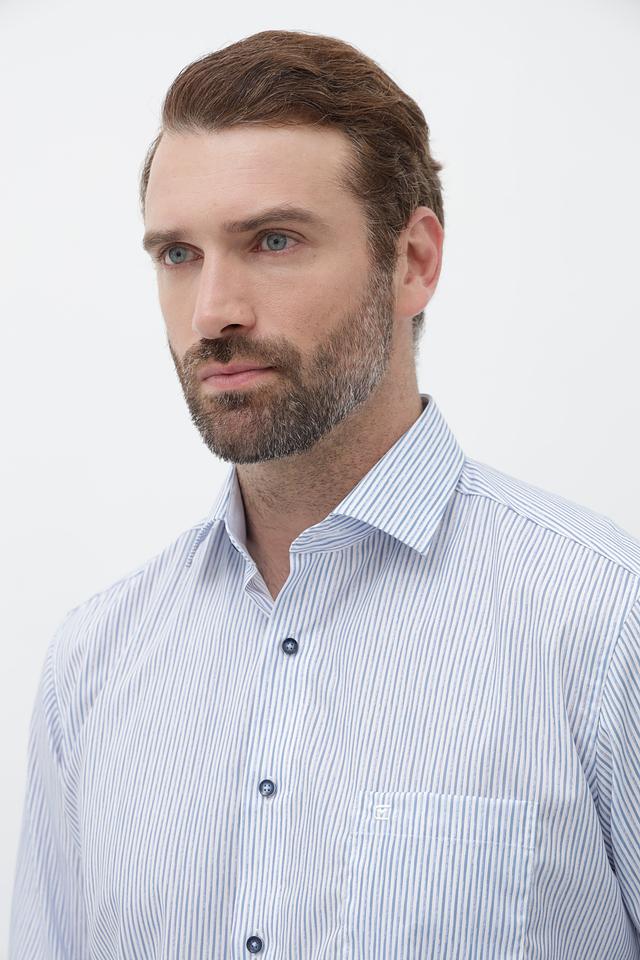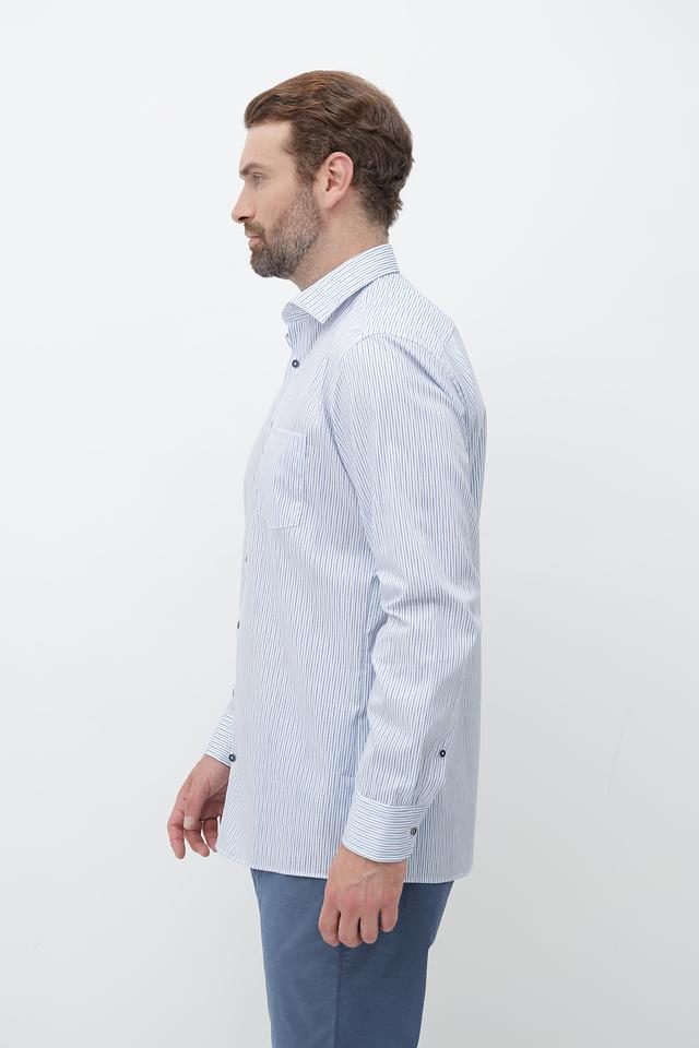 Рубашка имеет классический крой, длинные рукава и стандартный воротник. Голубая полоска придает ей свежий и современный вид, делая ее подходящей как для офиса, так и для повседневной носки.