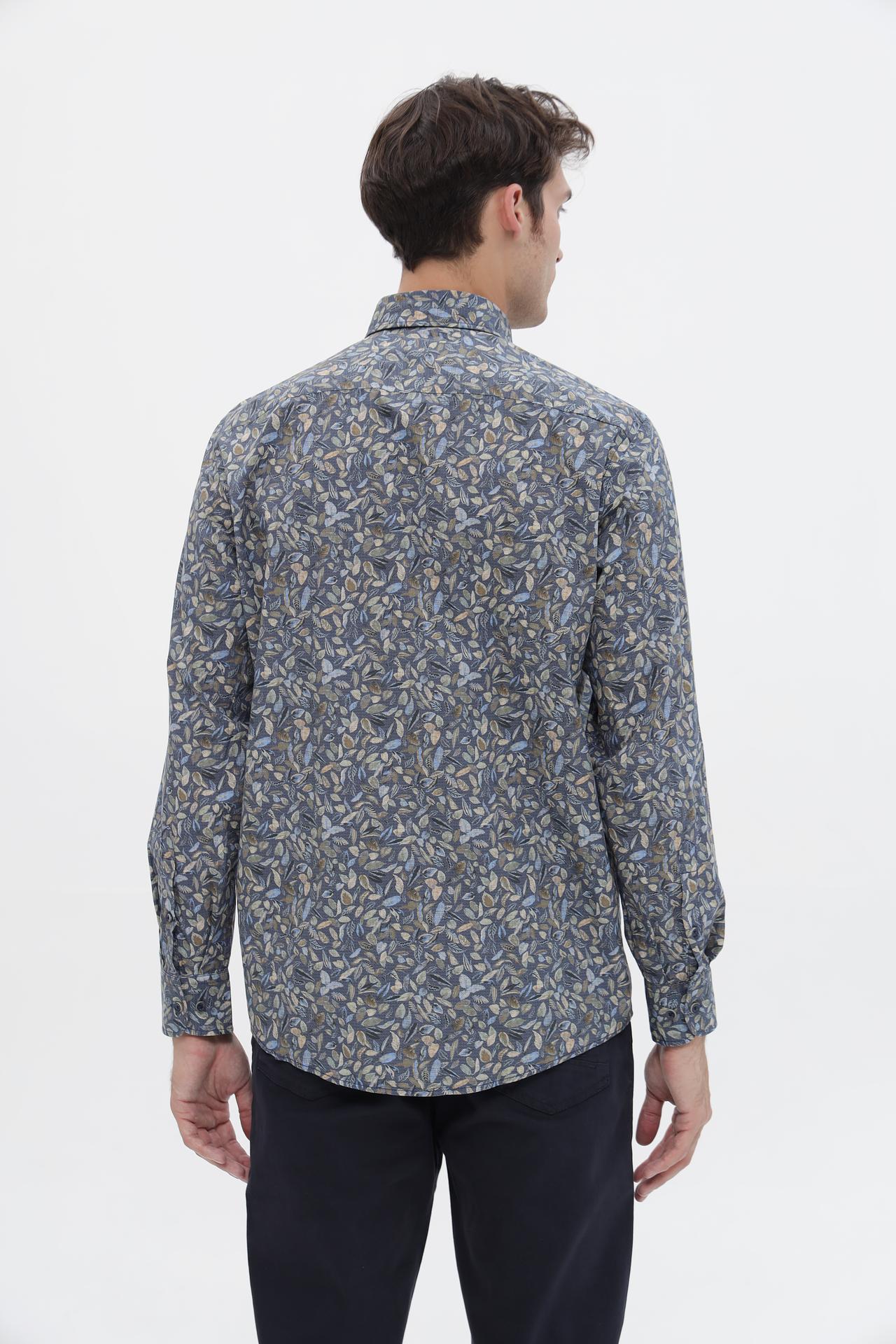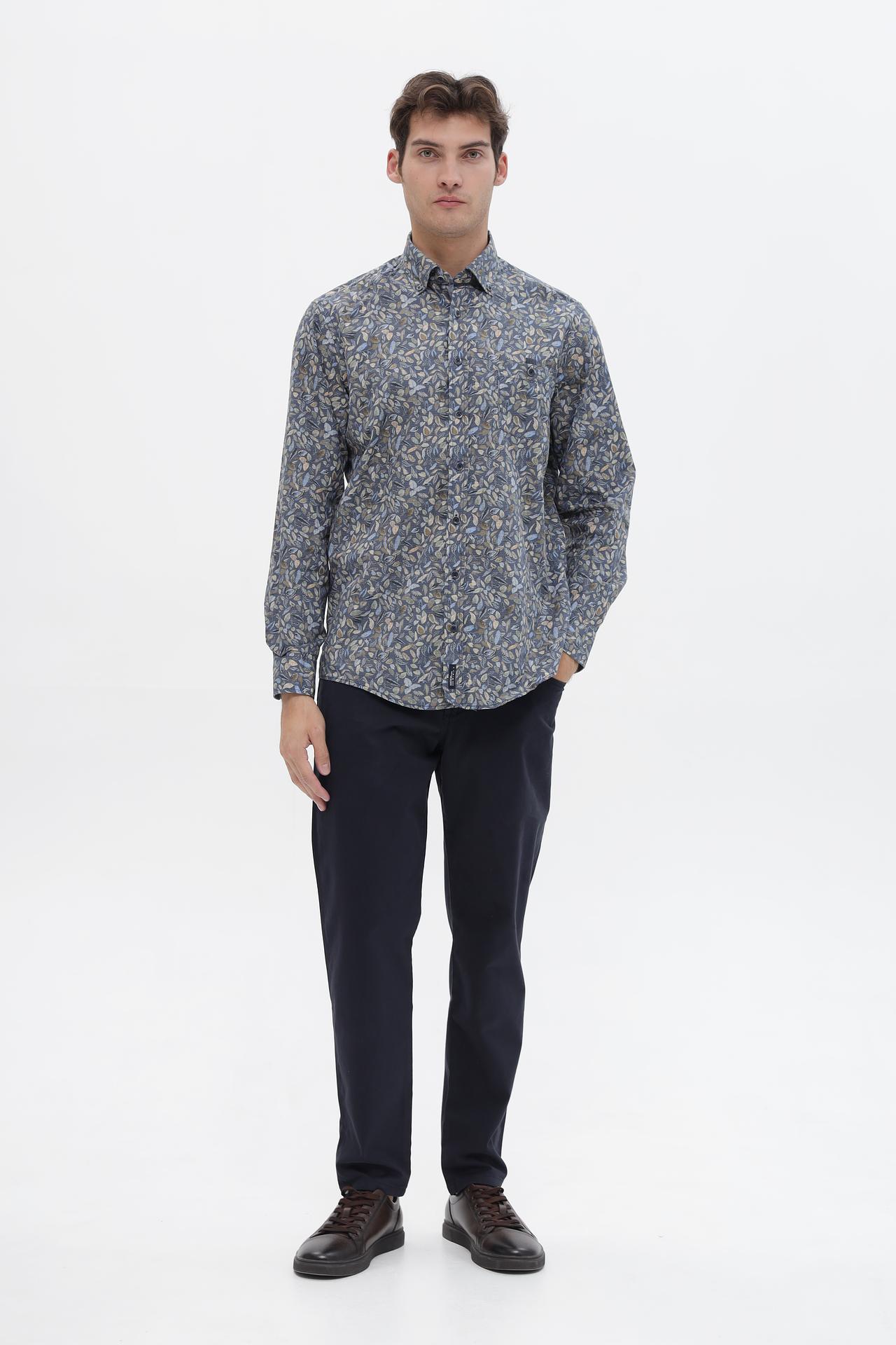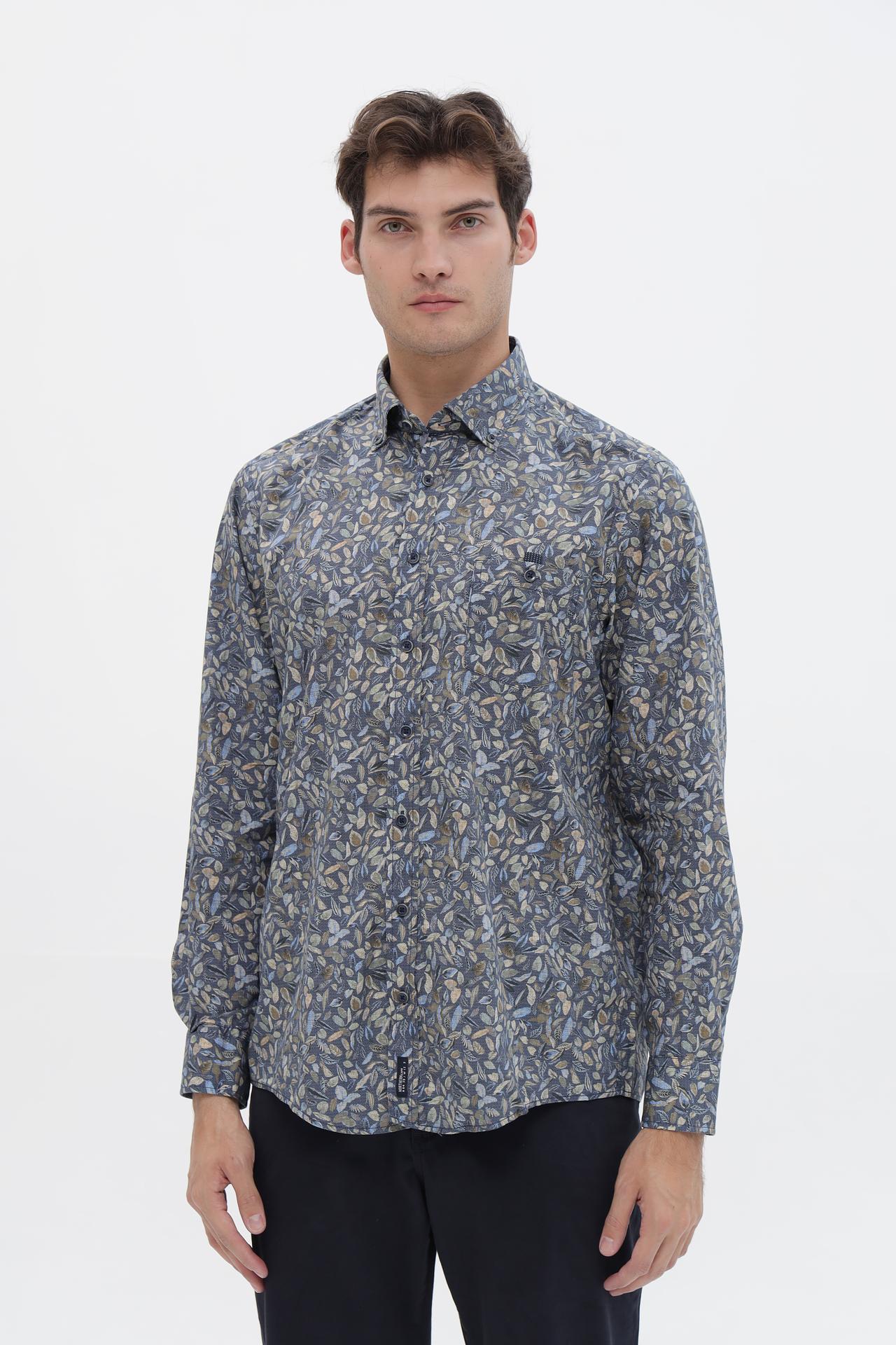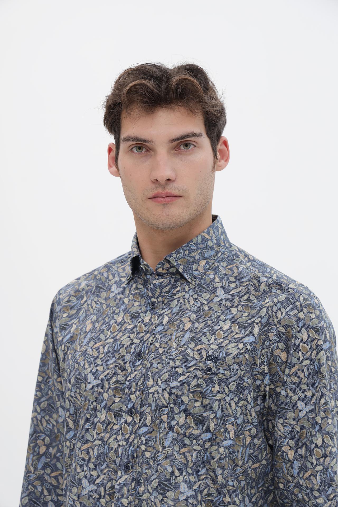 - Дизайн и принт: Рубашка украшена стильным принтом с изображением листьев, который добавляет образу индивидуальности. Классический крой и воротник делают ее универсальной.