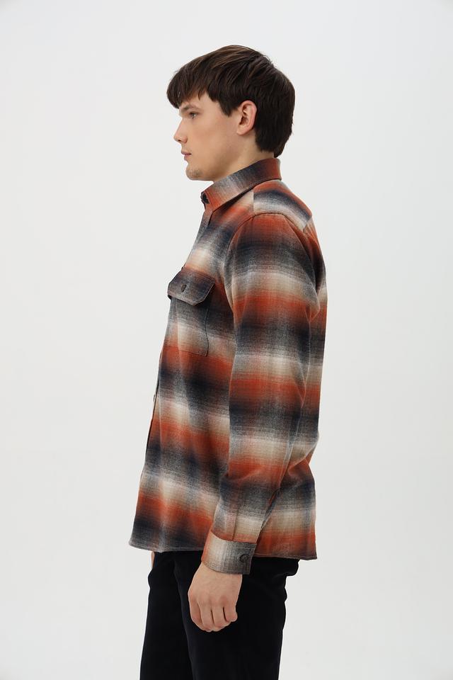 Рубашка имеет классический крой с длинными рукавами и стандартной посадкой. Застежка на пуговицы обеспечивает удобство ношения. На груди расположены два накладных кармана с клапанами, добавляющие функциональности и акцентирующие повседневный стиль.