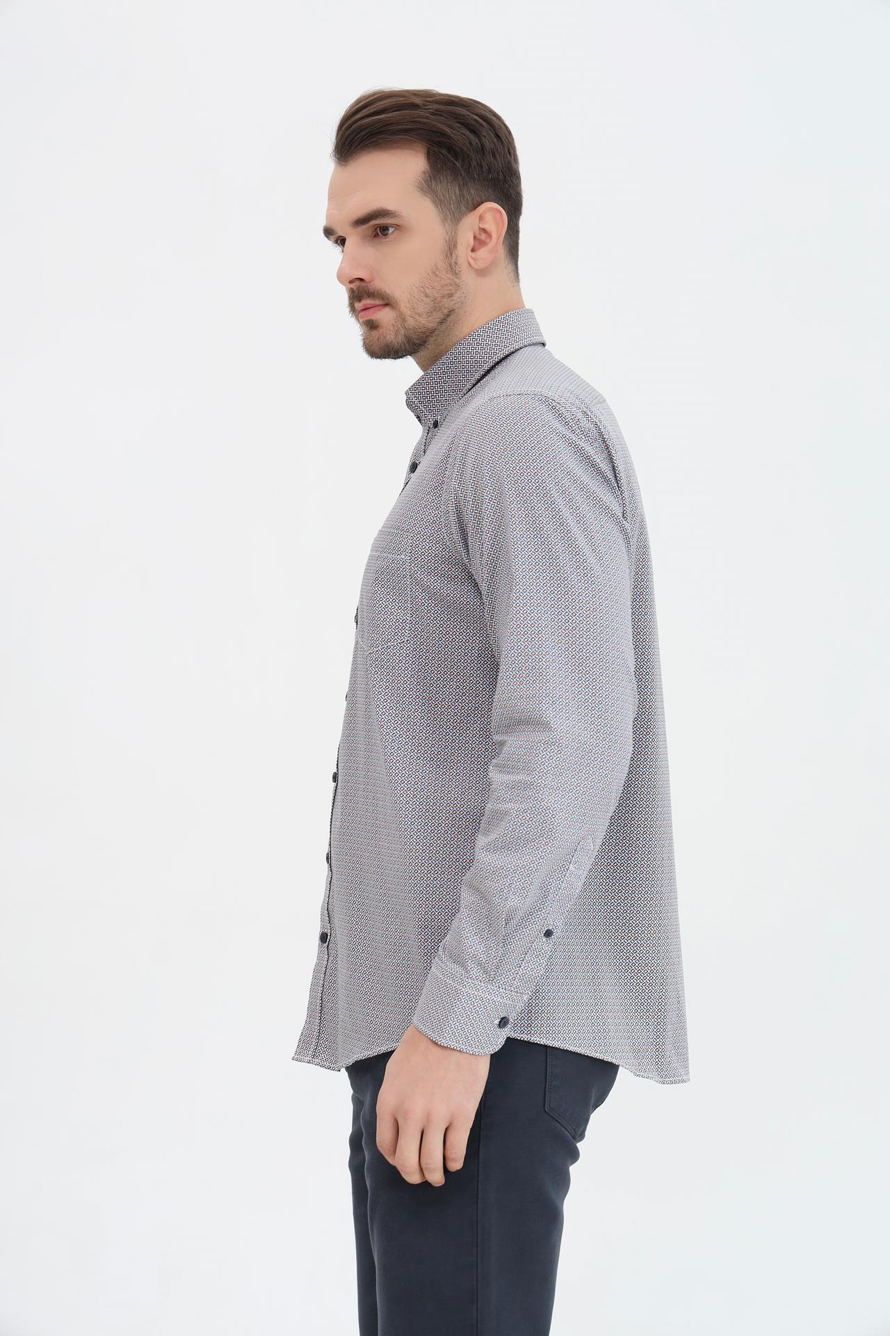 - Дизайн: Классический крой с длинным рукавом и воротником на пуговицах. Мелкий геометрический принт добавляет изысканности и универсальности.