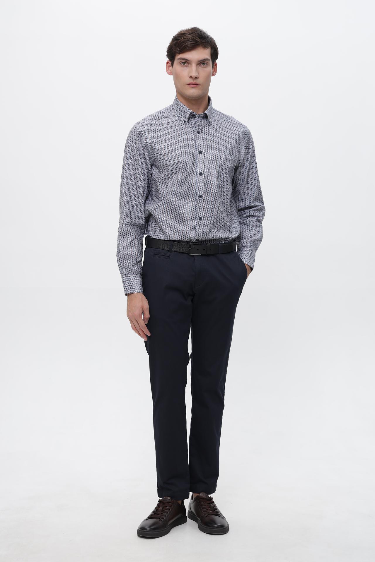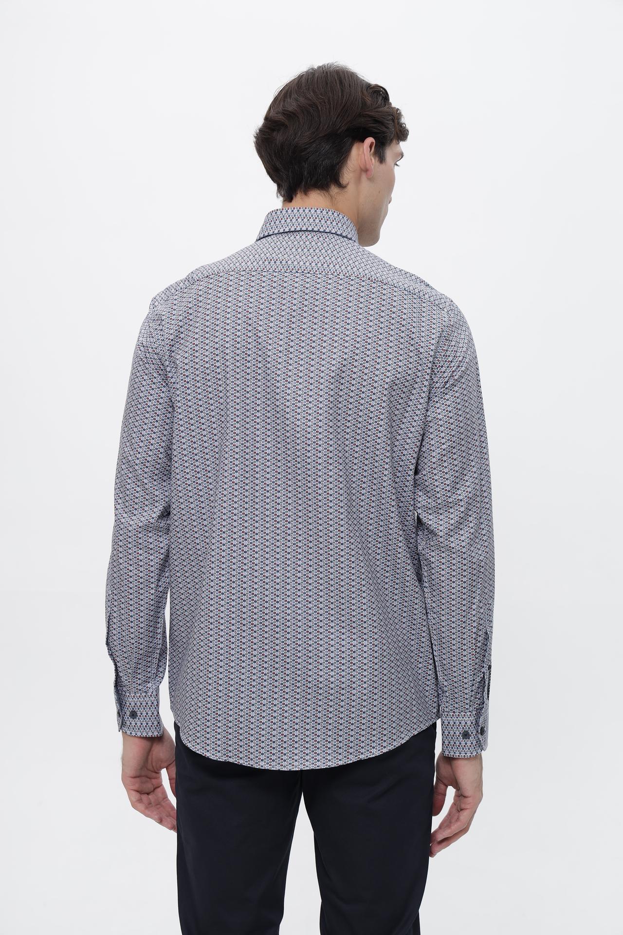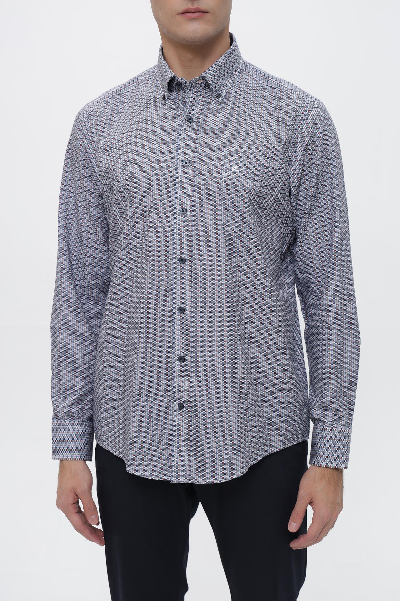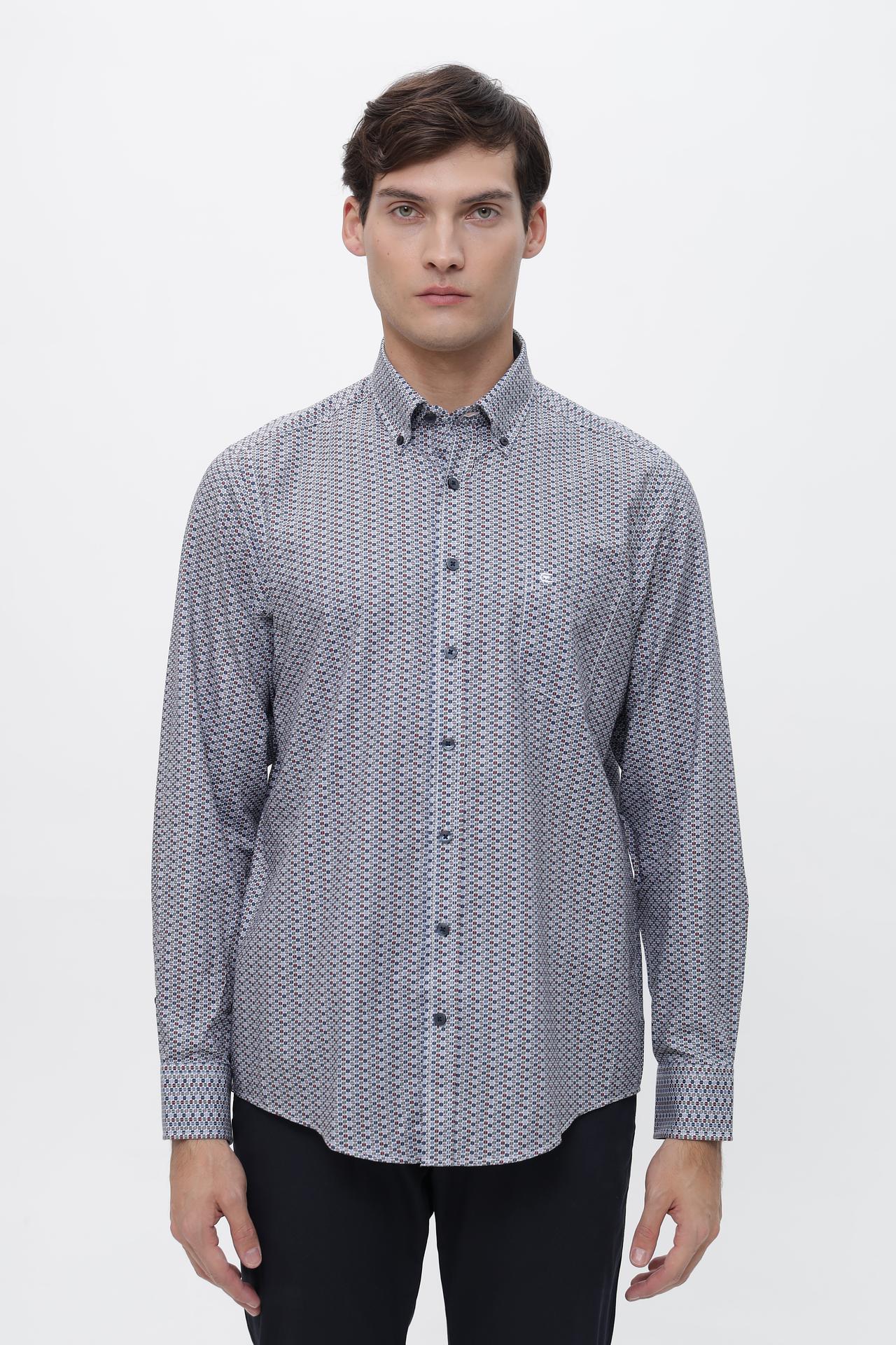 - Дизайн: Классический крой с длинным рукавом и воротником на пуговицах. Оригинальный геометрический узор в сине-красно-белых тонах придает рубашке изысканность.