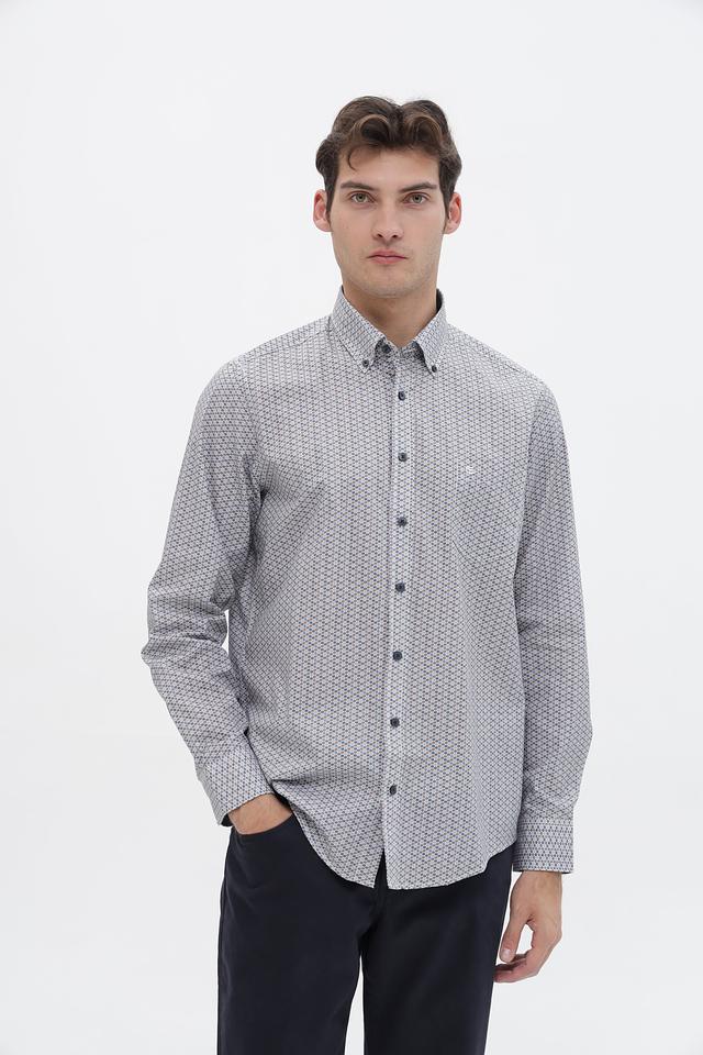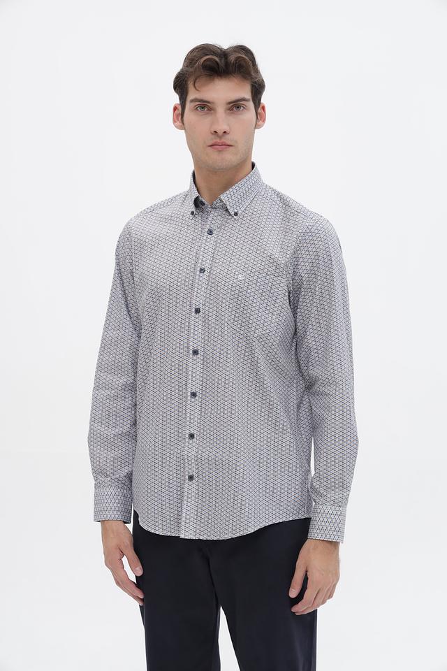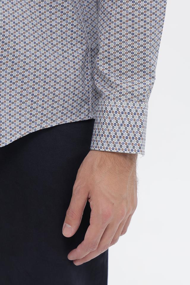 Принт рубашки представляет собой геометрический узор, который добавляет ей элегантности и стиля. Эта рубашка станет отличным дополнением к вашему гардеробу и подойдёт для различных случаев – от повседневной носки до деловых встреч.