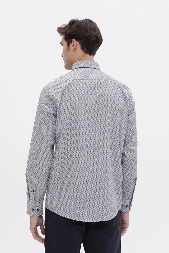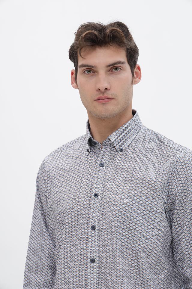Мужская рубашка от бренда Casa Moda выполнена из высококачественного 100% хлопка. Преобладающий цвет рубашки – серый, с мелким узором, состоящим из тёмно-синих и белых элементов.