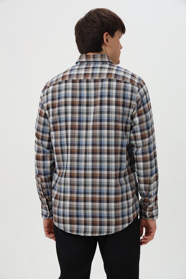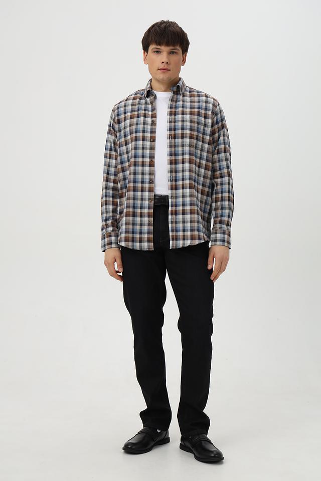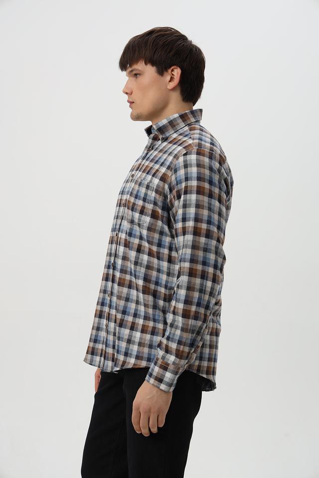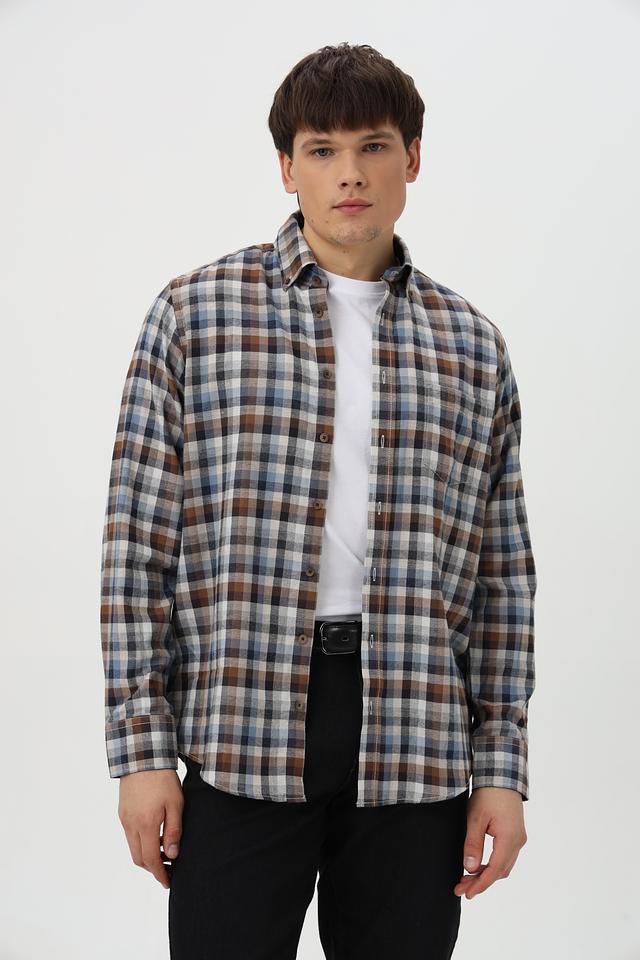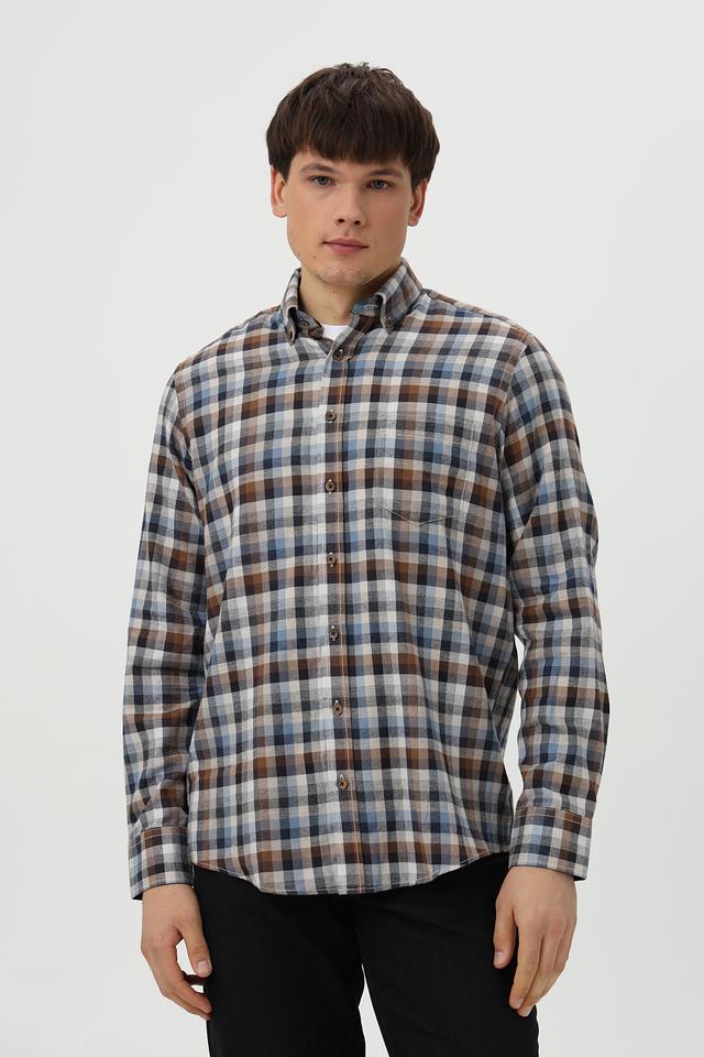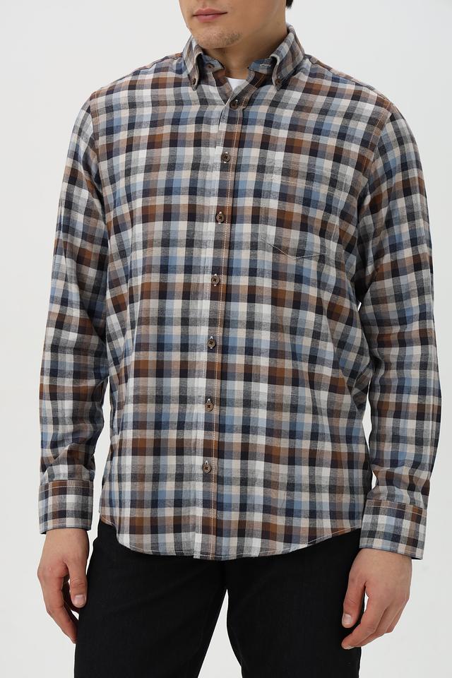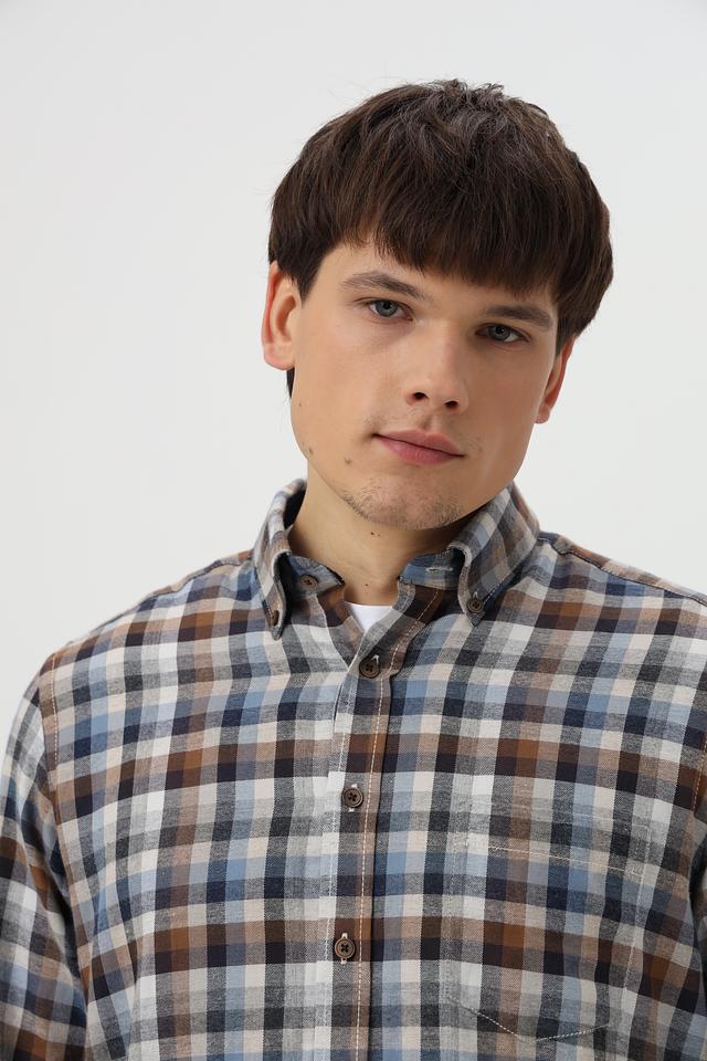 Рубашка имеет классический крой с длинными рукавами и традиционным воротником. Она оформлена в клетку, сочетающую в себе оттенки коричневого, синего и белого, что придает ей стильный и универсальный вид.