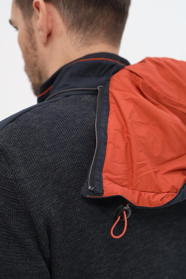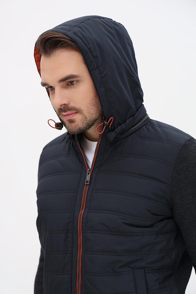Передняя часть и капюшон куртки выполнены из стеганой ткани, а рукава и спинка – из мягкого вязаного трикотажа. Капюшон имеет оранжевую подкладку, что добавляет акцент и оригинальности. Куртка застегивается на молнию с яркой оранжевой окантовкой. В области груди расположен удобный накладной карман.