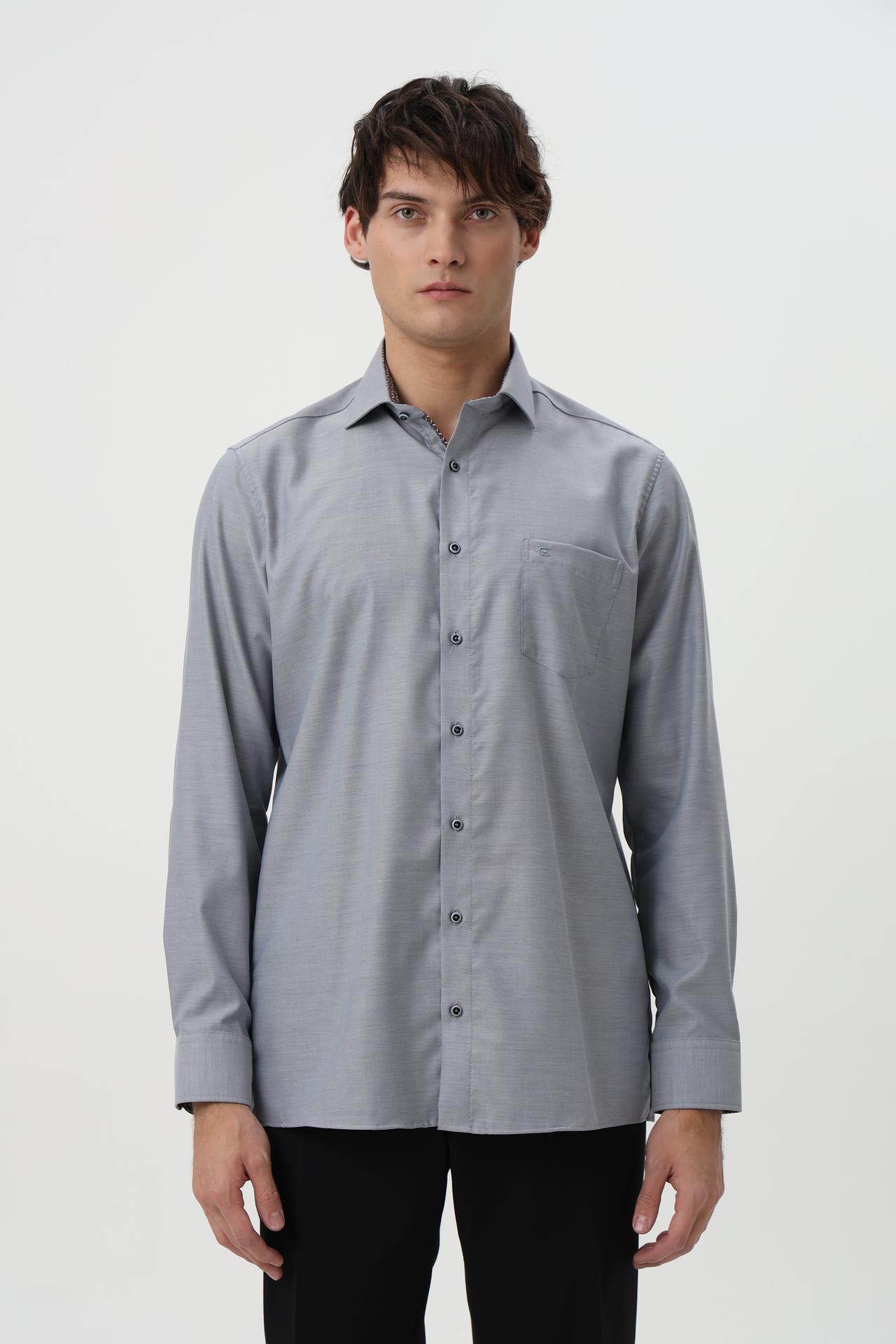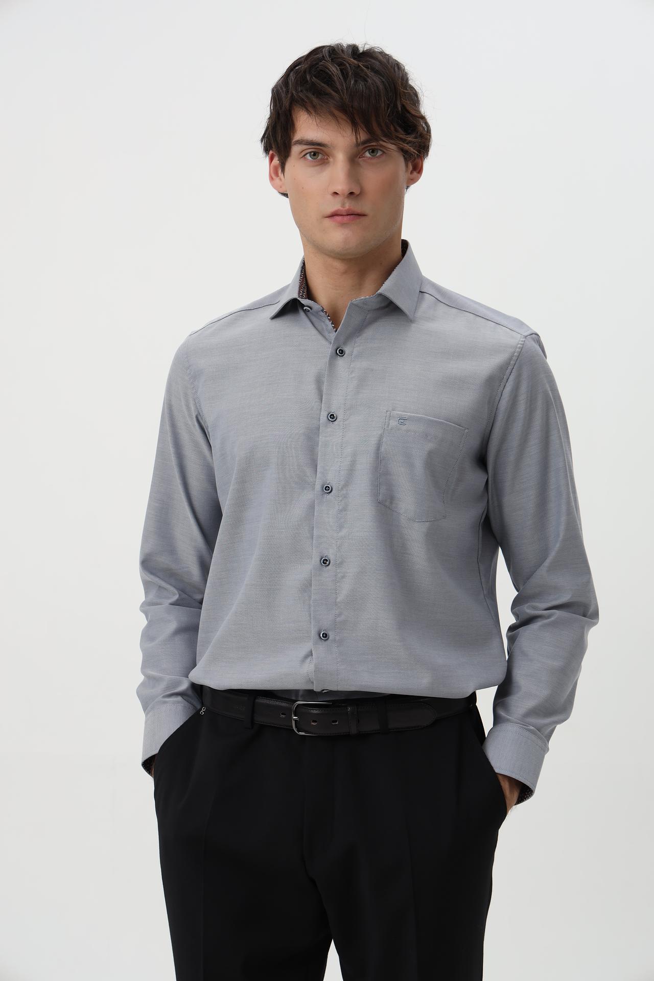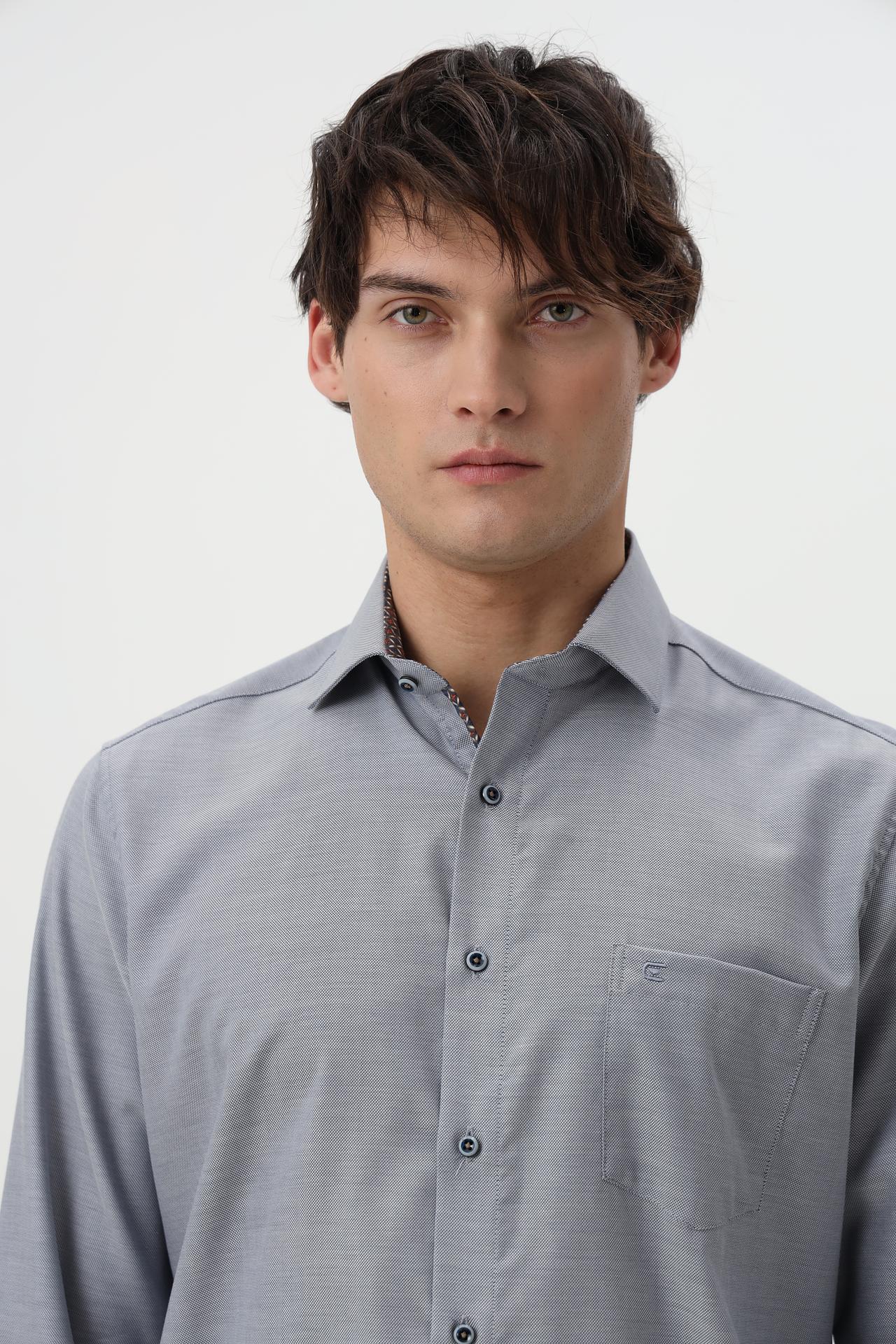 Сочетание минималистичного дизайна и высокого качества делает эту рубашку универсальным элементом гардероба, подходящим как для деловых встреч, так и для повседневного ношения. Серый цвет и мелкий узор ткани добавляют изысканности.