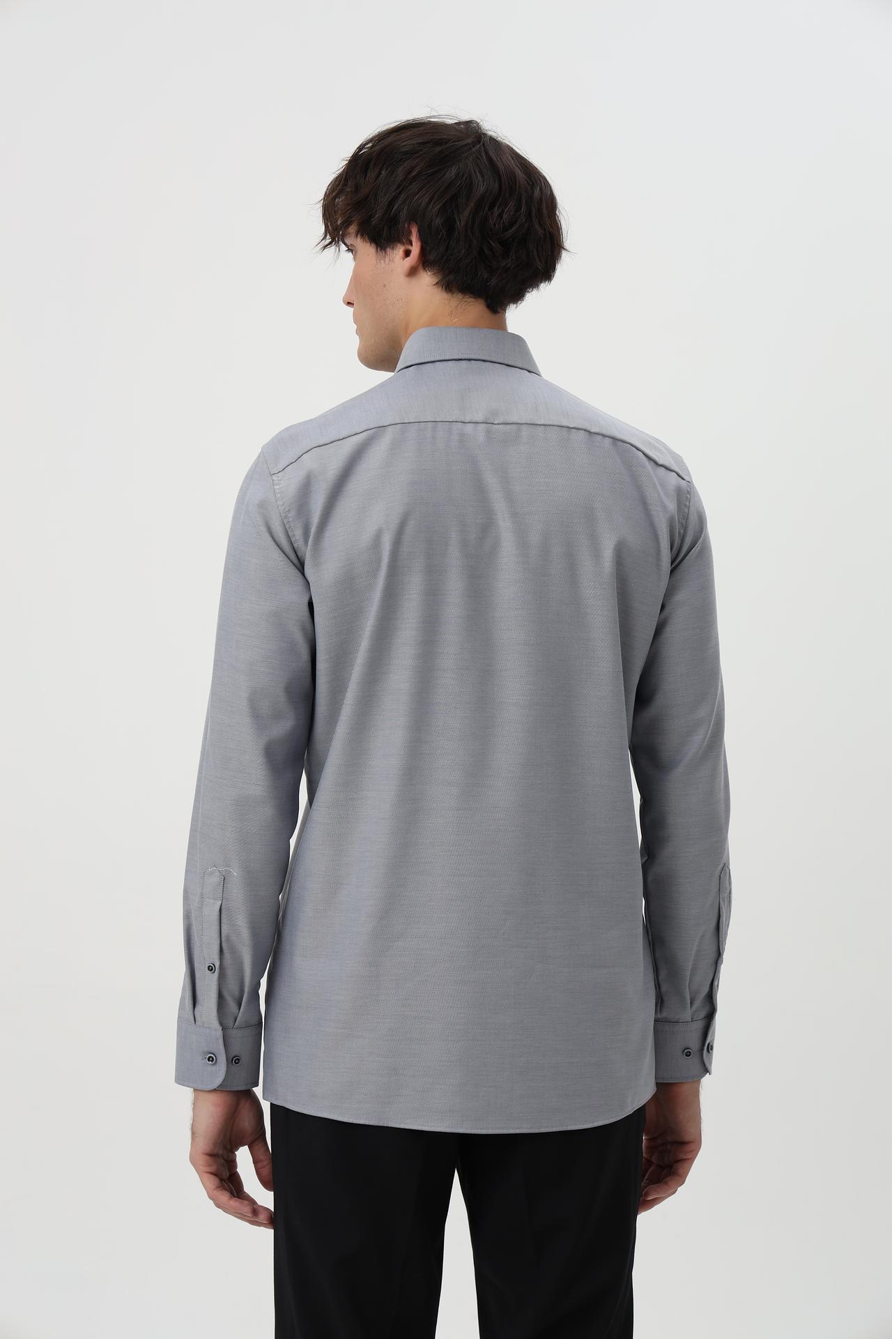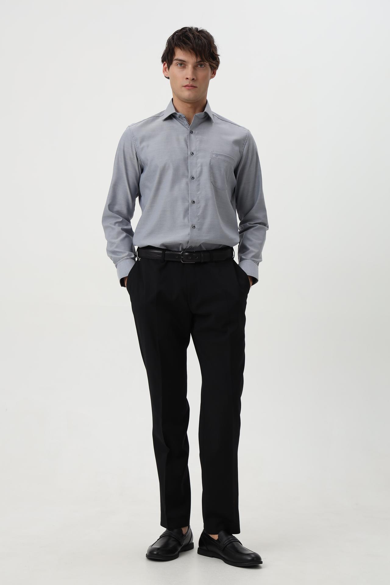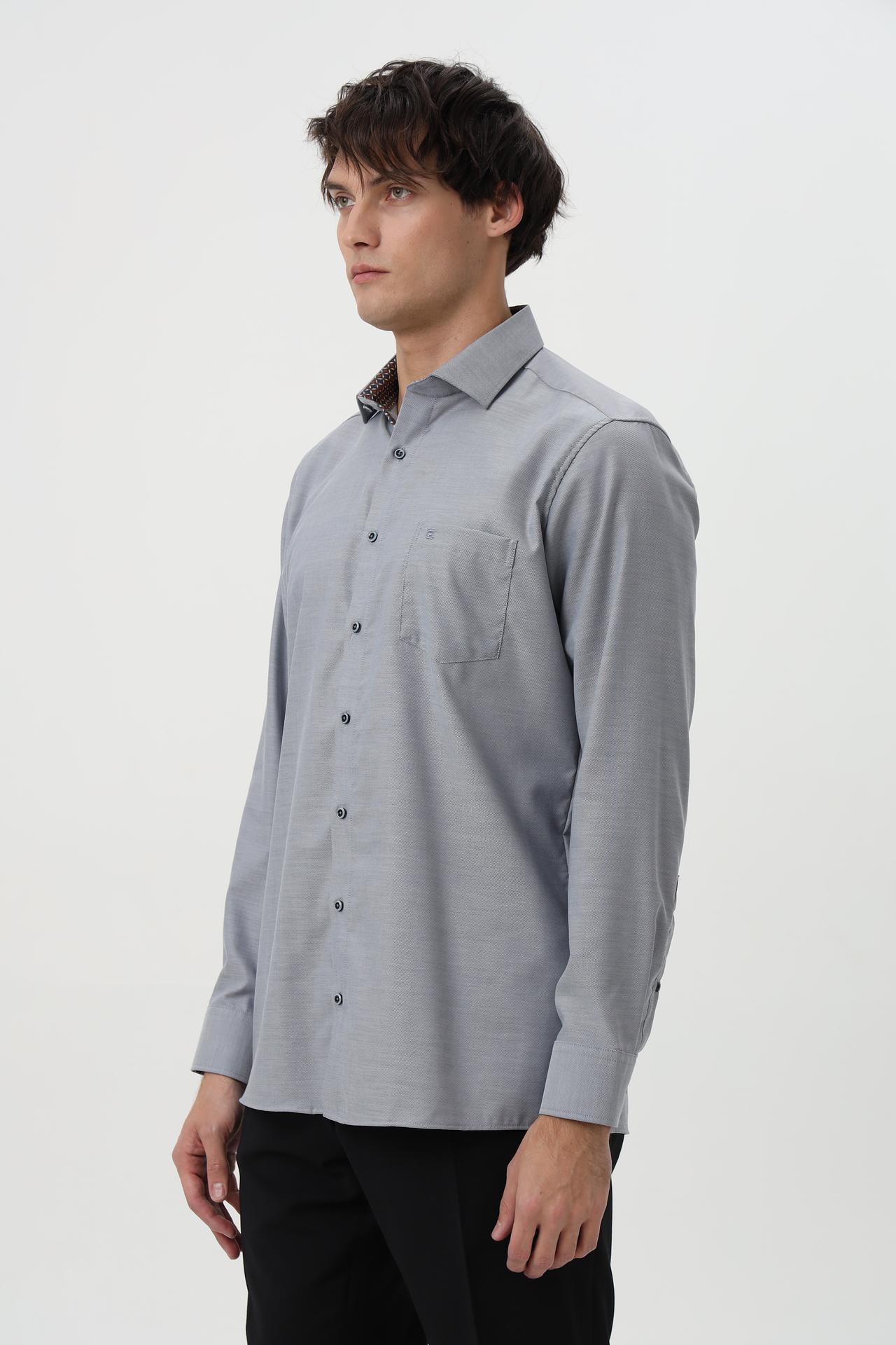 Сочетание минималистичного дизайна и высокого качества делает эту рубашку универсальным элементом гардероба, подходящим как для деловых встреч, так и для повседневного ношения. Серый цвет и мелкий узор ткани добавляют изысканности.