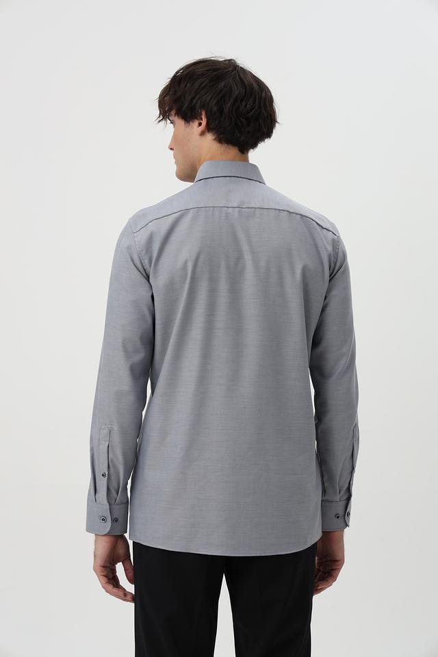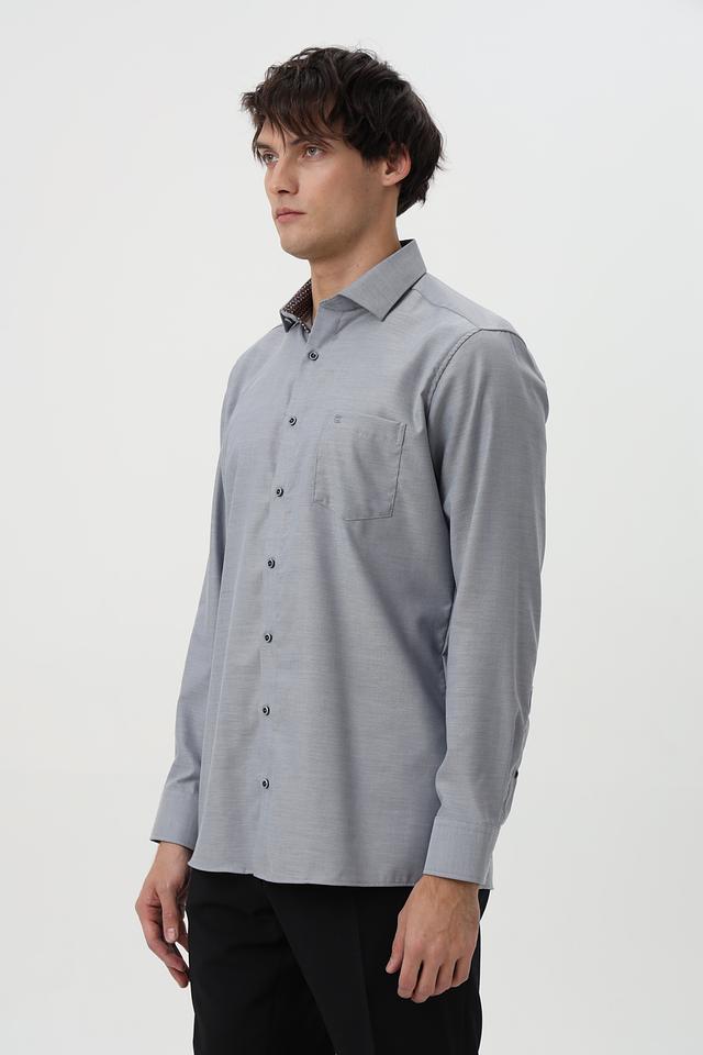Рубашка выполнена в сером цвете. Внутренняя часть воротника и манжеты имеют декоративный принт.