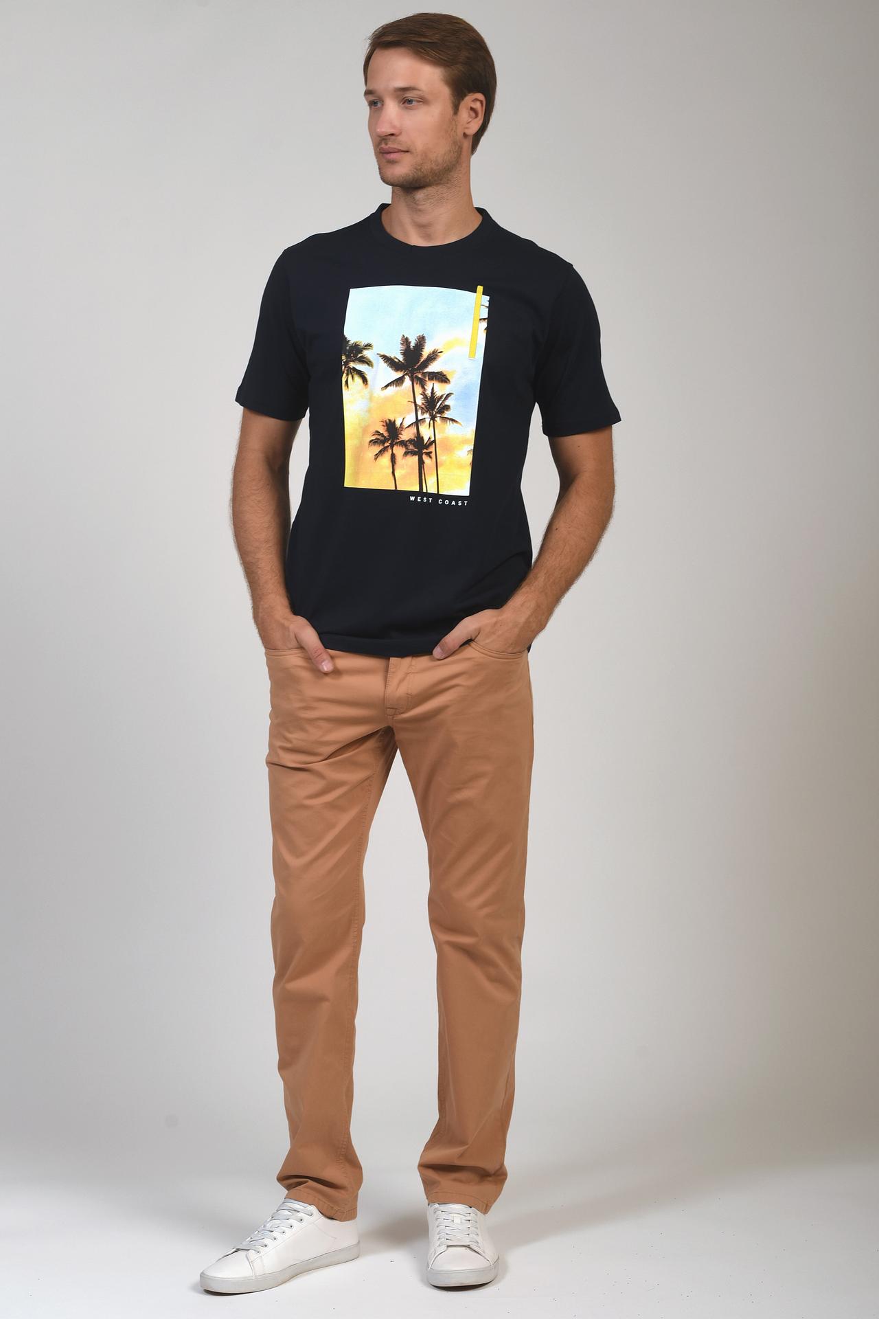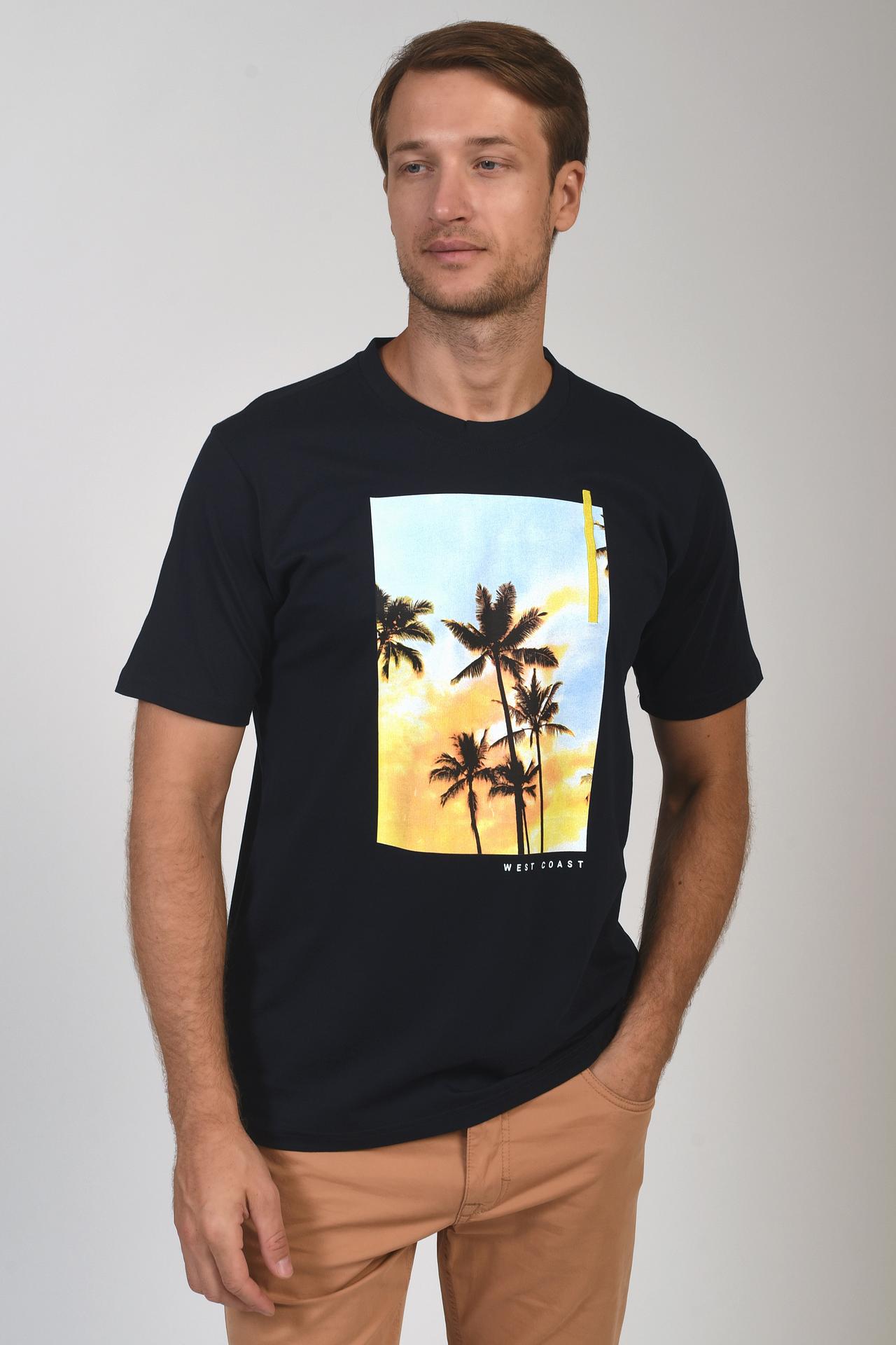 - Дизайн: Футболка украшена ярким принтом с изображением пальм и надписью "West Coast", который добавляет образу летнего настроения и индивидуальности. Классический круглый вырез и короткие рукава делают модель универсальной.