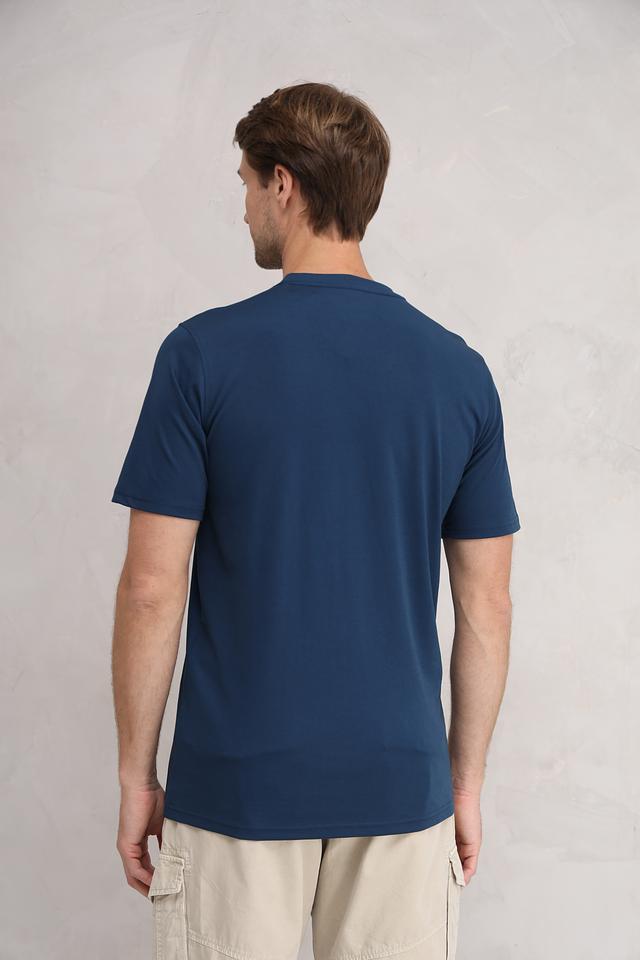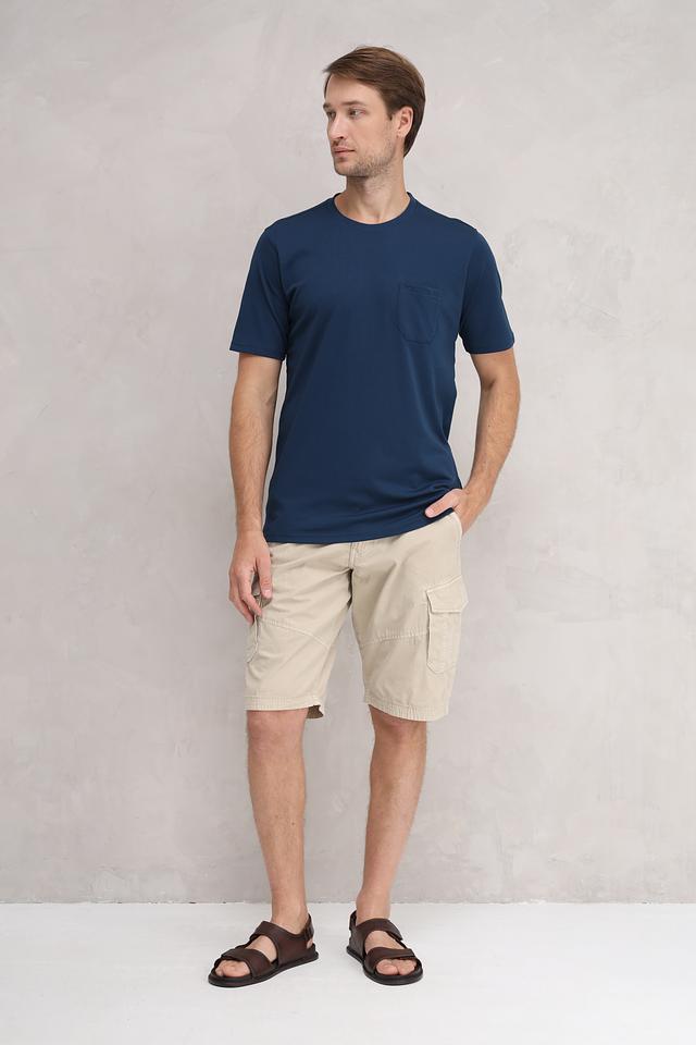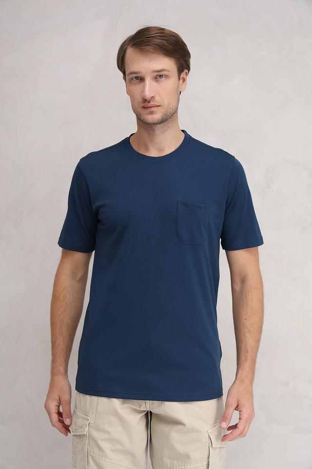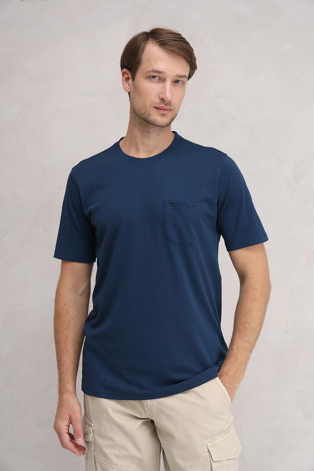 Футболка имеет классический прямой крой, короткие рукава и круглый вырез горловины. На левой стороне груди располагается накладной карман, который добавляет функциональности и стиля. Ткань приятна к телу и хорошо держит форму.