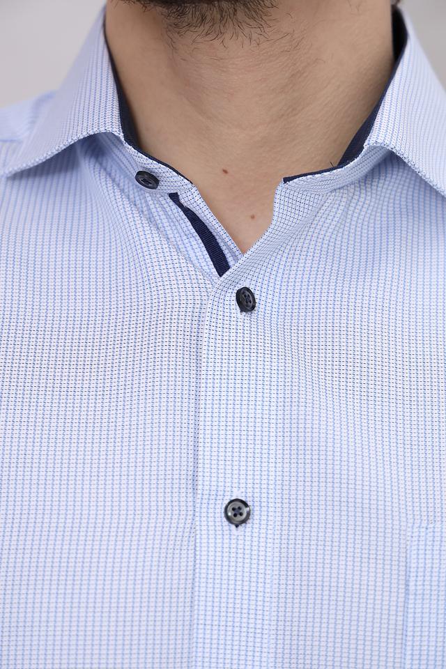 Воротник рубашки имеет внутреннюю отделку из тёмно-синей ткани, что добавляет изысканности. На груди расположен накладной карман. Эта рубашка станет отличным дополнением к вашему гардеробу и подойдет для различных случаев – от деловых встреч до повседневной носки.