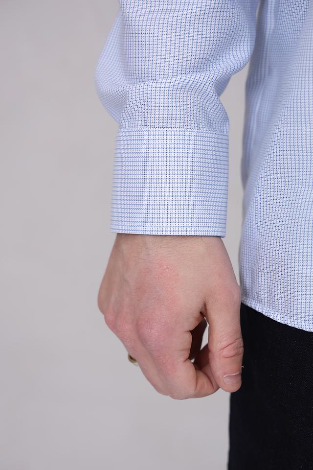 Рубашка имеет классический крой с длинными рукавами и стандартным воротником. Манжеты на рукавах застегиваются на пуговицы. Застежка рубашки выполнена на пуговицах по всей длине.