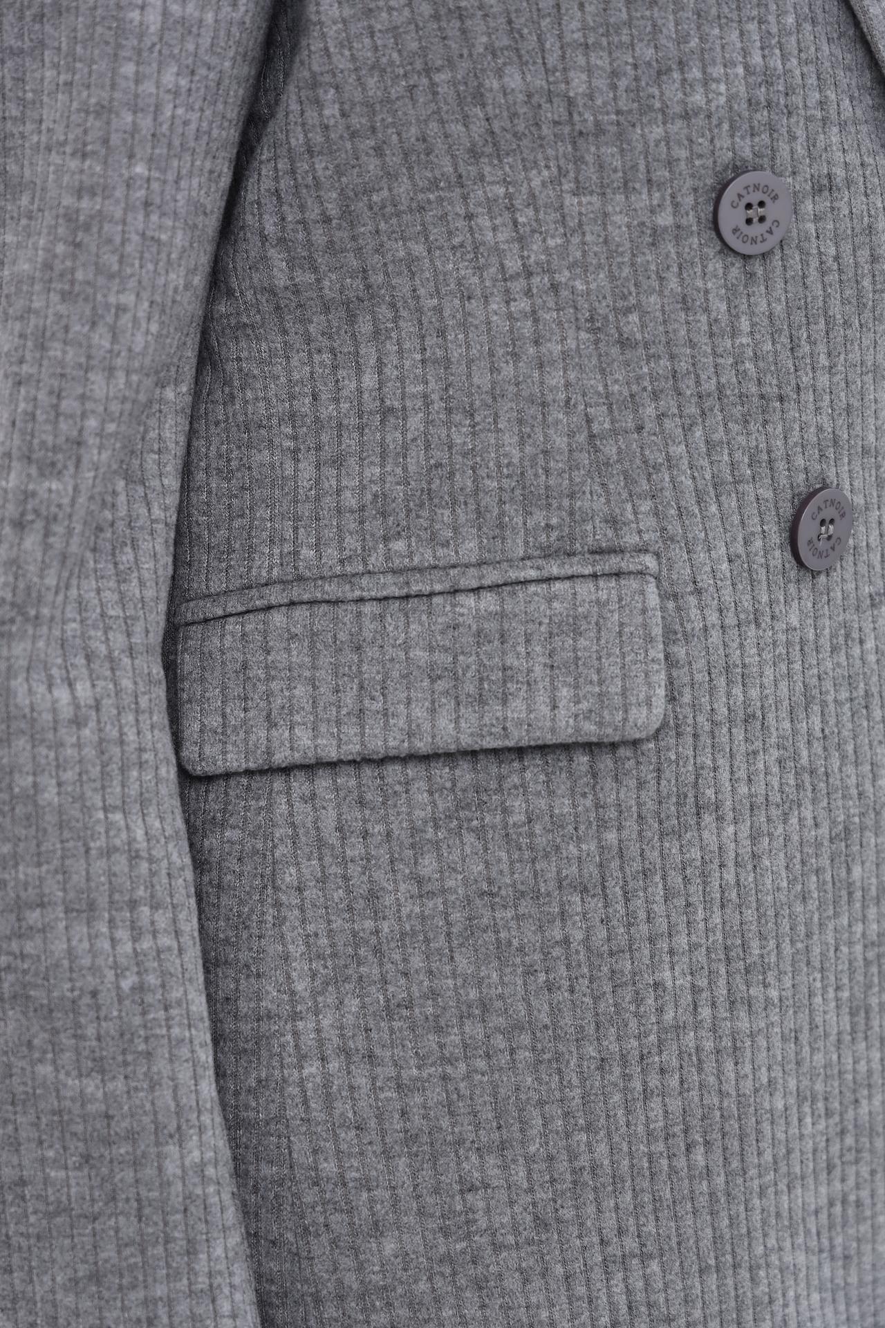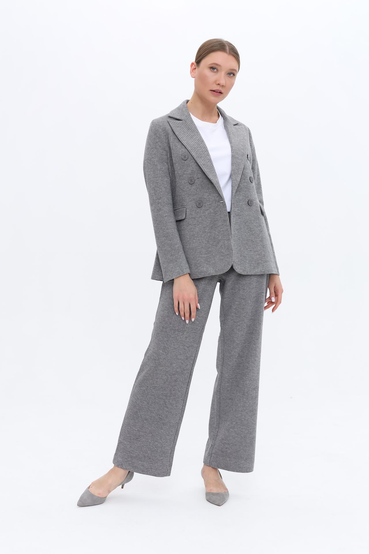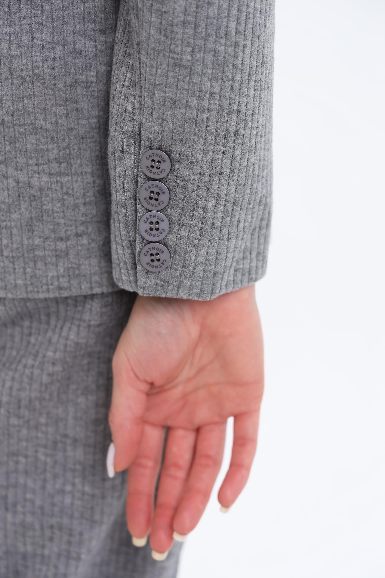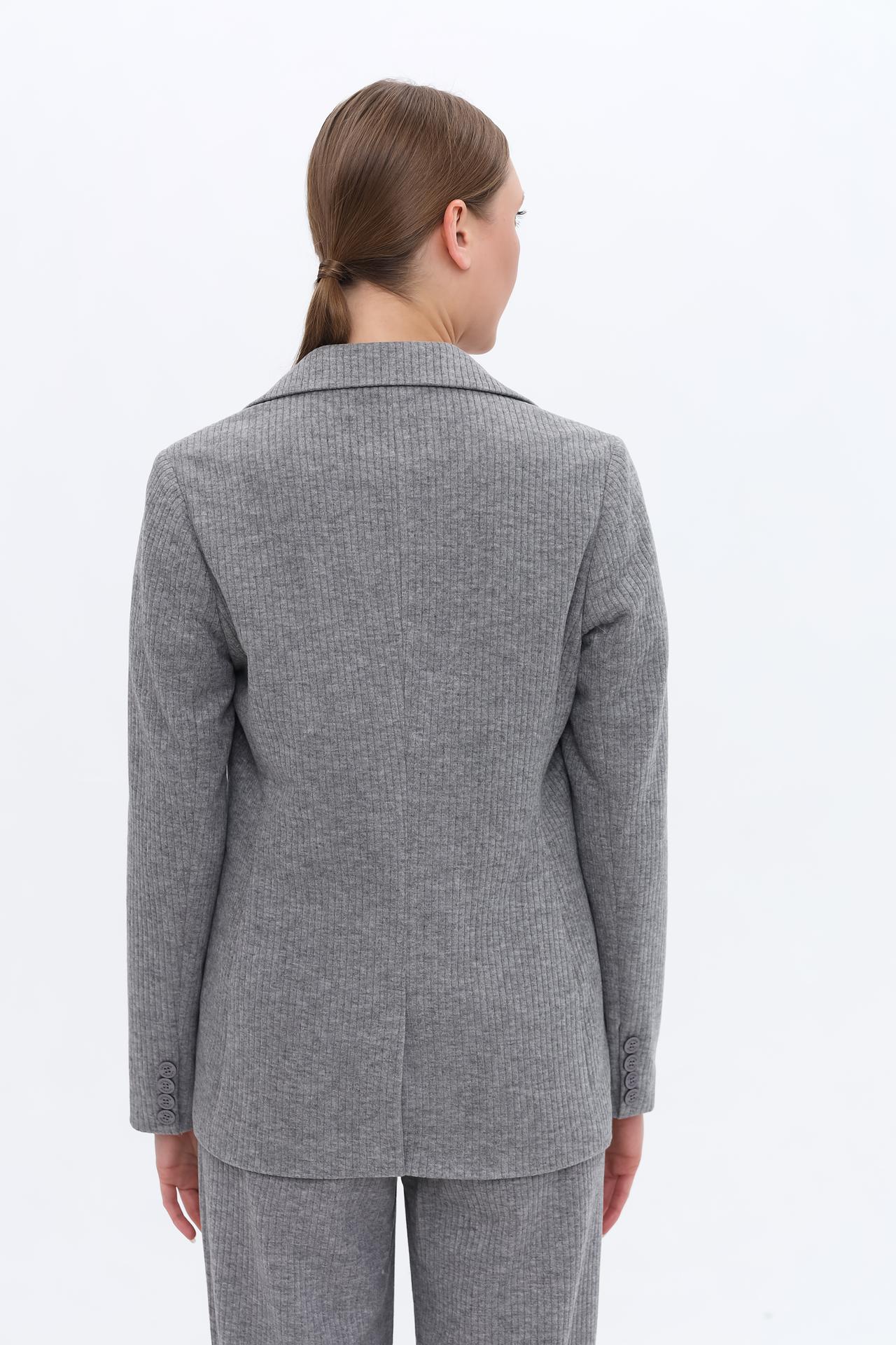 - Текстура: Ткань с выраженной вертикальной ребристой структурой, которая придает жакету объем и визуальную глубину.