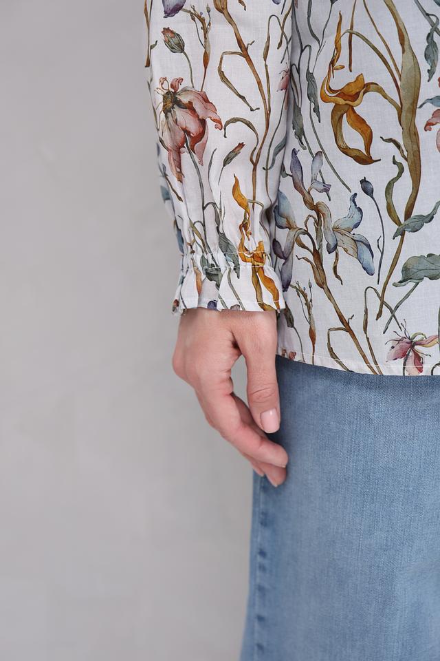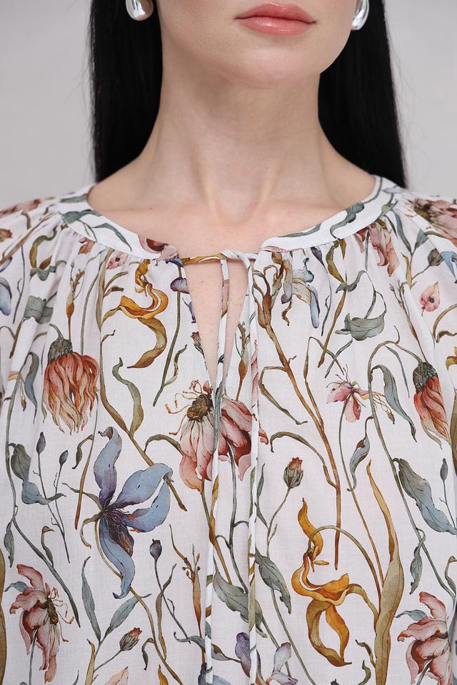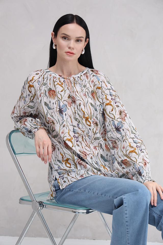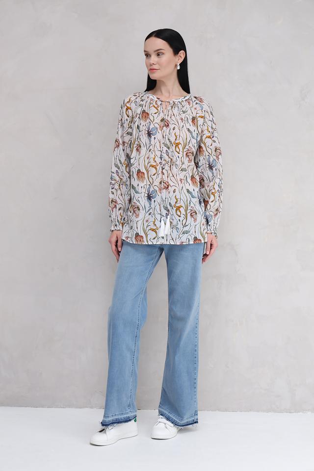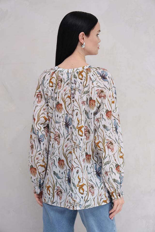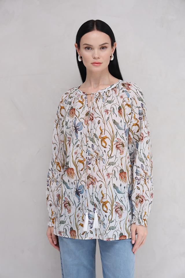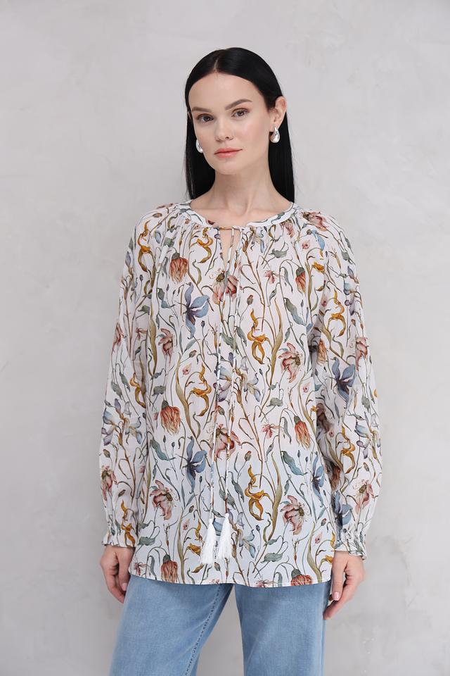 Особенностью данной модели является яркий и красочный цветочный принт, который добавляет блузе женственности и очарования. V-образный вырез горловины и длинные рукава с манжетами придают блузе изысканность и завершённость.