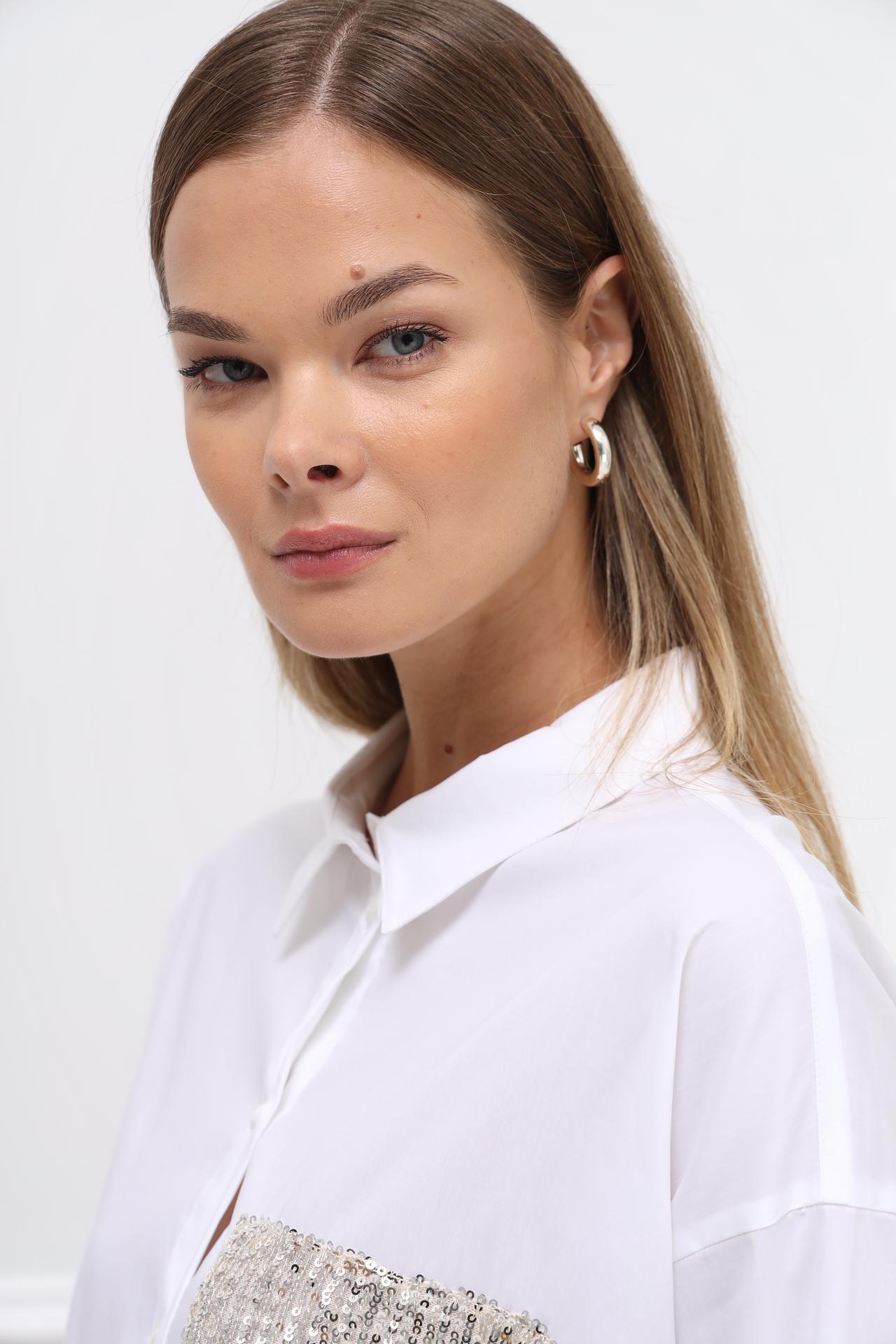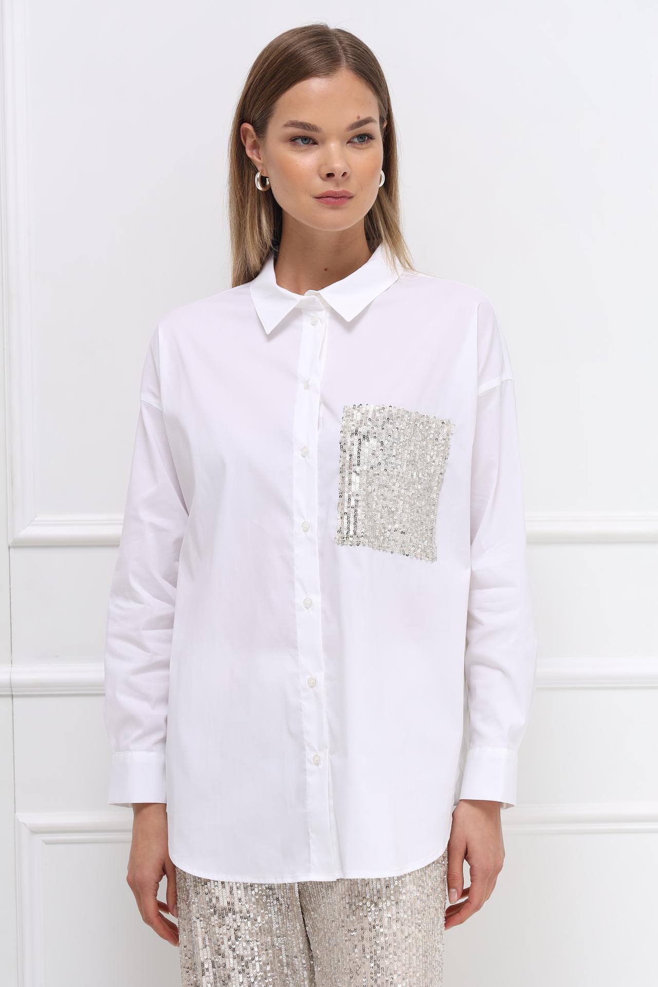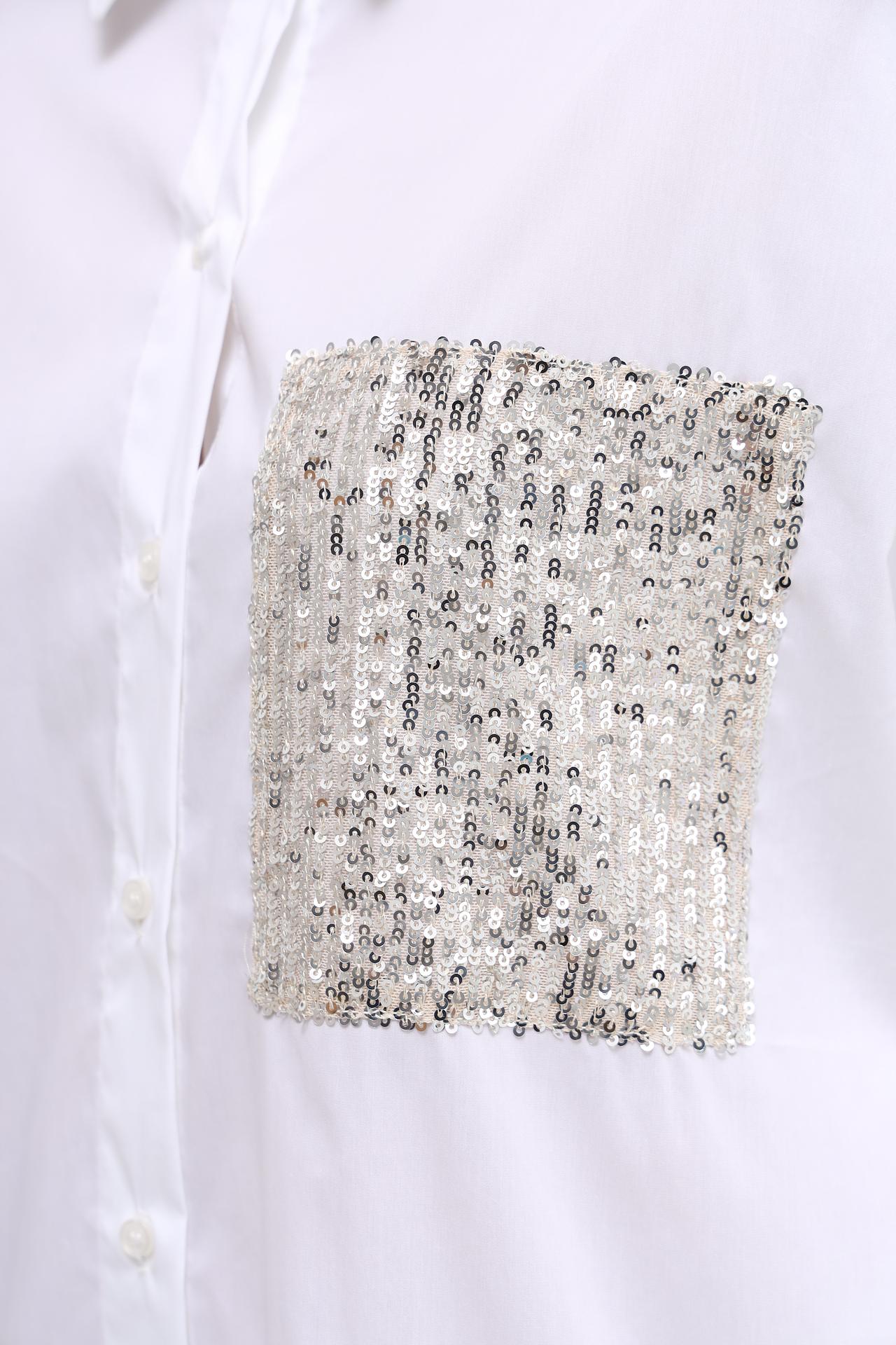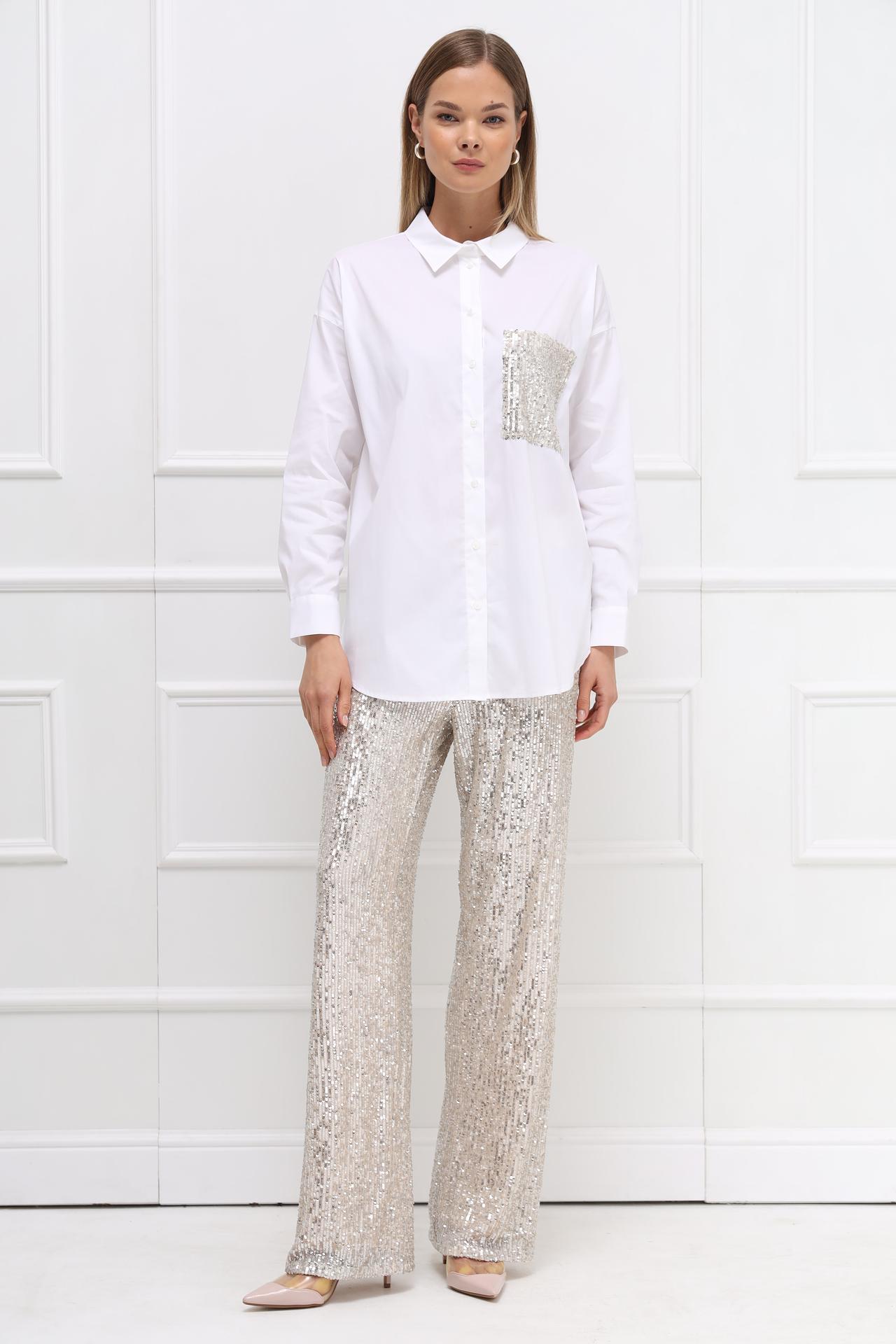 - Декоративный элемент: Карман декорирован пайетками, добавляя образу праздничности и шика.