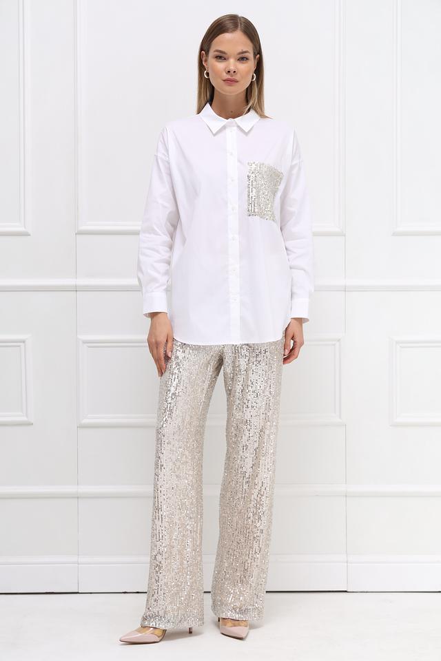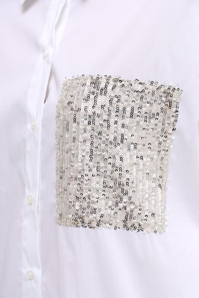 Особенностью модели является накладной карман с отделкой из сверкающих пайеток, который придает рубашке праздничный и нарядный вид. Рубашка идеально подойдет для создания как повседневных, так и вечерних образов.