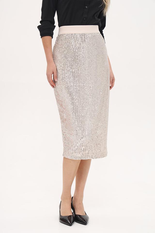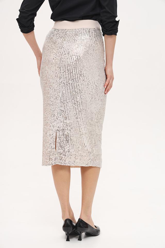 Основной материал юбки – это ткань, полностью покрытая мерцающими пайетками серебристого цвета. Высокая посадка и эластичный пояс обеспечивают удобство и подчеркивают талию. Классическая длина миди делает юбку универсальной и подходящей для различных случаев.
