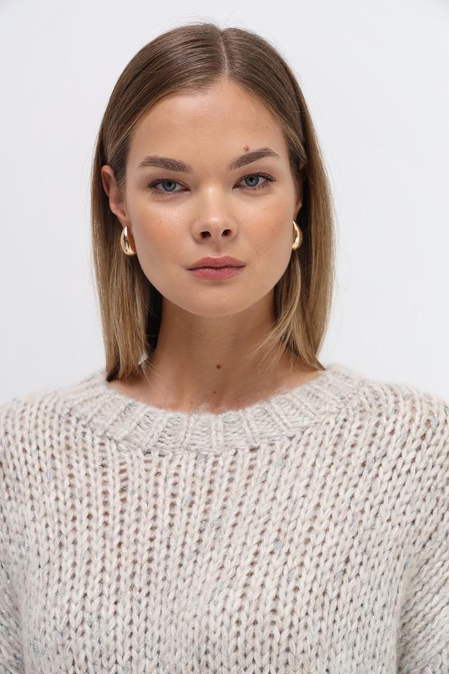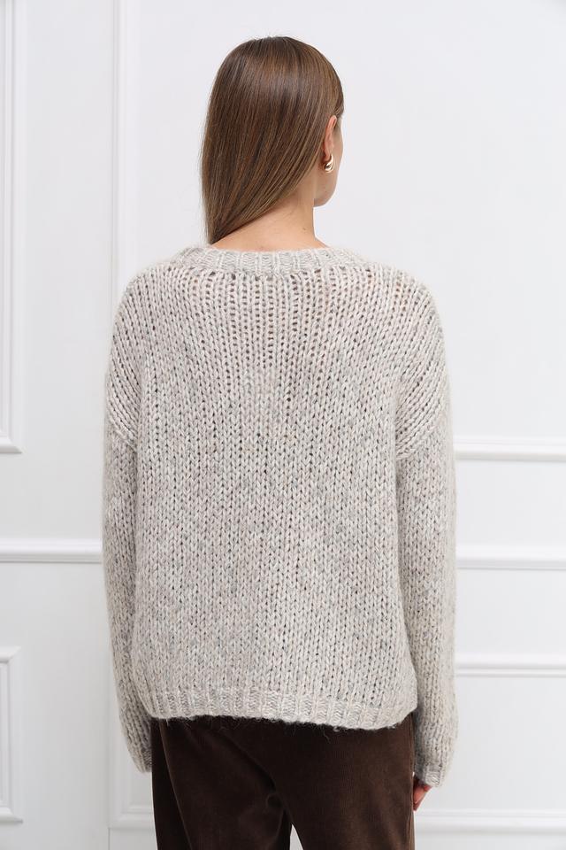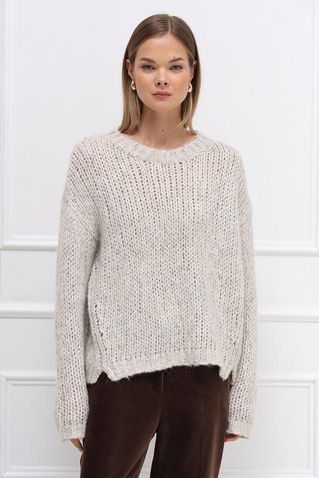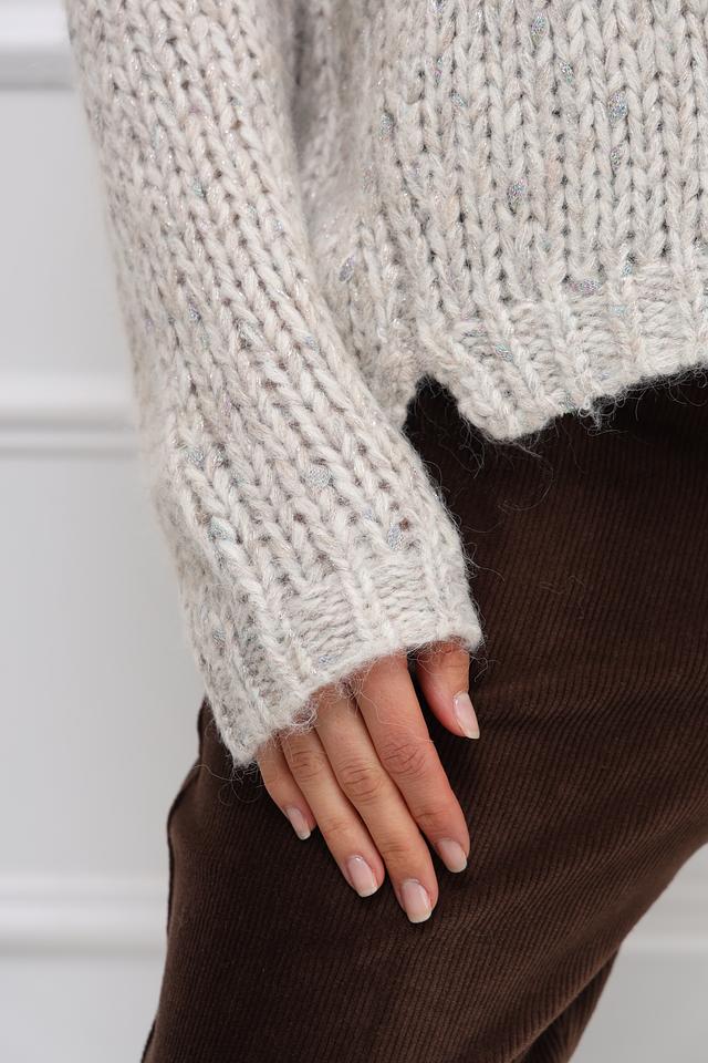 Бежевый пуловер Catnoir свободного кроя выполнен из мягкой пряжи с добавлением шерсти и альпаки. Модель имеет округлый вырез горловины и объёмную текстуру крупной вязки. Состав: полиамид 31%, акрил 28%, полиэстер 19%, шерсть 10%, метализ.нить 8%, альпака 4%