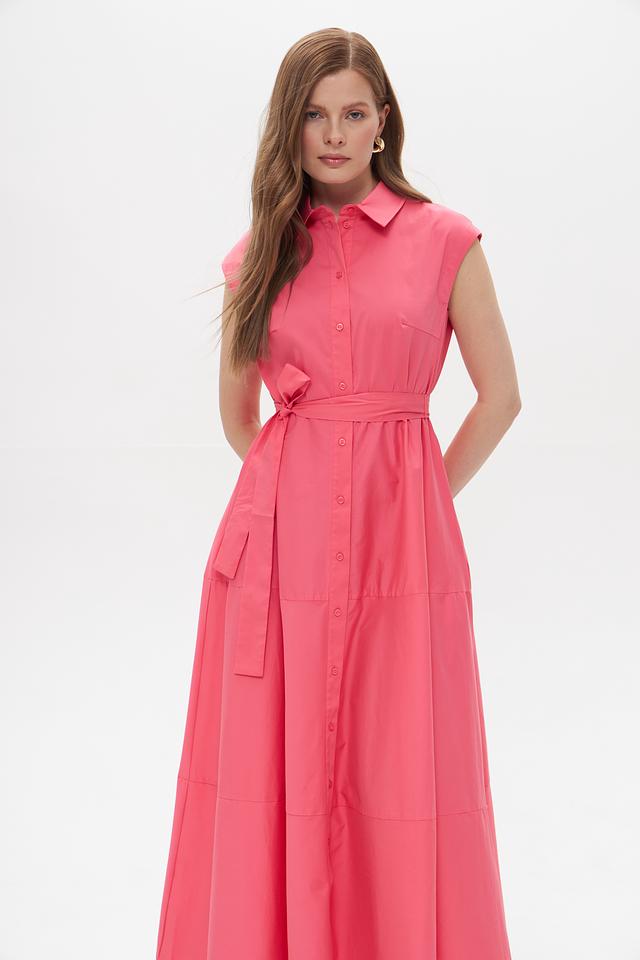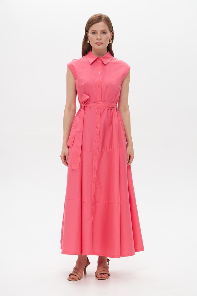 Платье имеет воротник-стойку, застегивается на пуговицы по всей длине и дополнено поясом, который подчеркивает талию. Накладные карманы добавляют практичности и расслабленности образу.