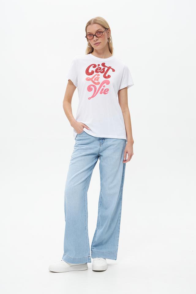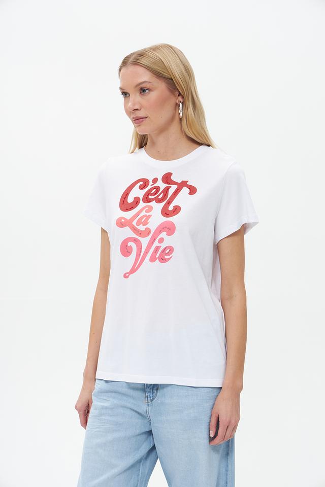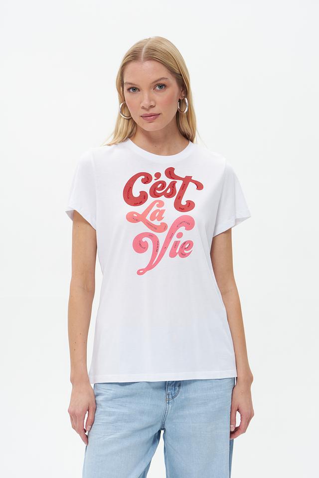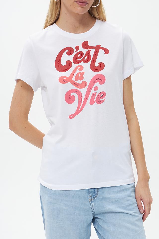 Особый шарм этой модели придает крупный, стилизованный принт «C’est La Vie» розового цвета, расположенный по центру. Такая футболка добавит игривости и индивидуальности вашему образу.