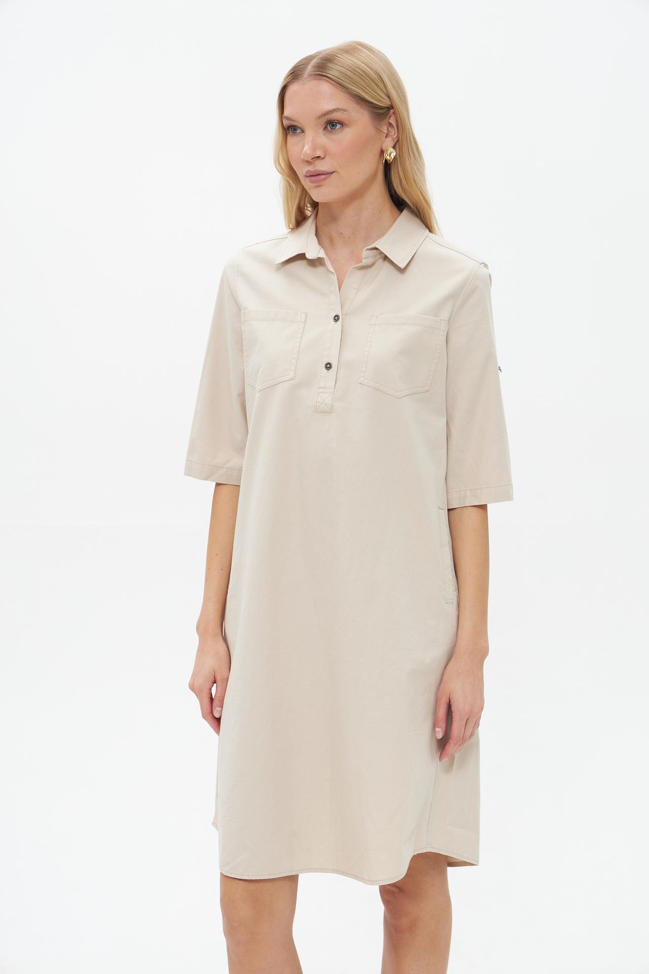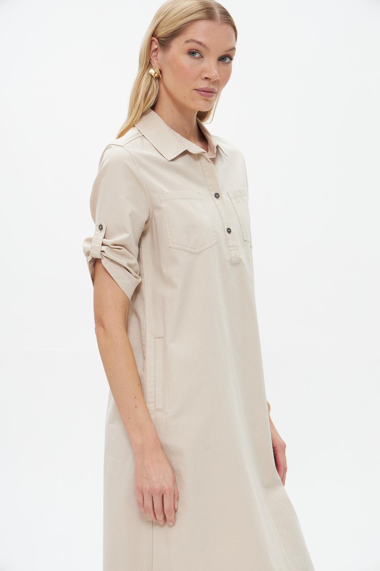 - Универсальность: Бежевое платье-рубашка легко комбинируется с различными аксессуарами и обувью, позволяя создавать разнообразные образы. Подходит как для офиса, так и для прогулок или неформальных встреч.