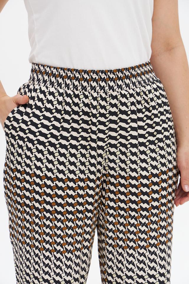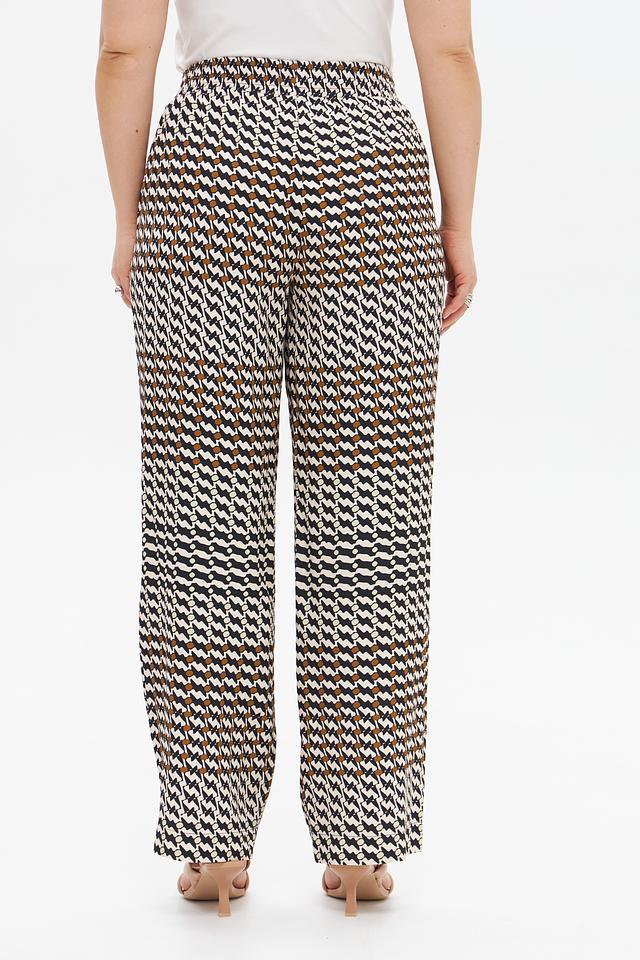 Особенностью модели является яркий геометрический принт, сочетающий в себе оттенки белого, черного и коричневого. Прямой крой и эластичный пояс на талии обеспечивают удобную посадку по фигуре.