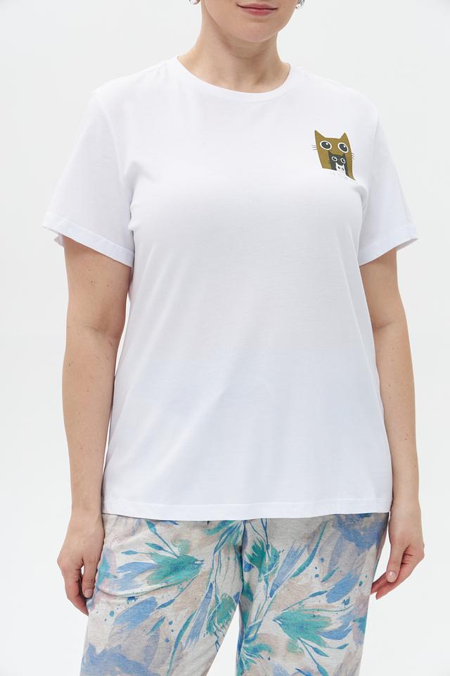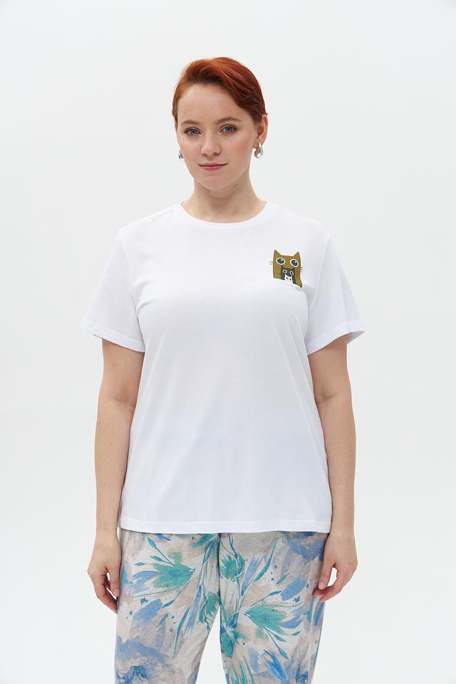 Футболка имеет прямой крой и короткие рукава, что делает ее идеальной для теплой погоды. Оригинальный принт с изображением котика добавляет игривости и индивидуальности образу.