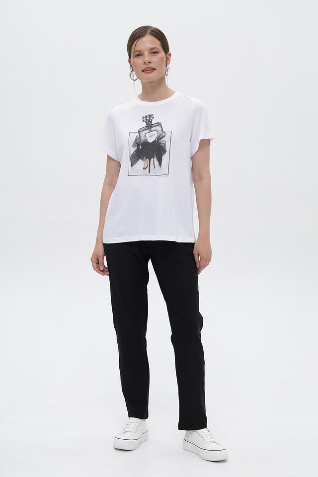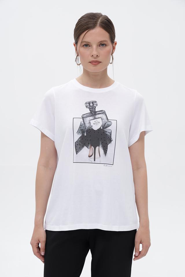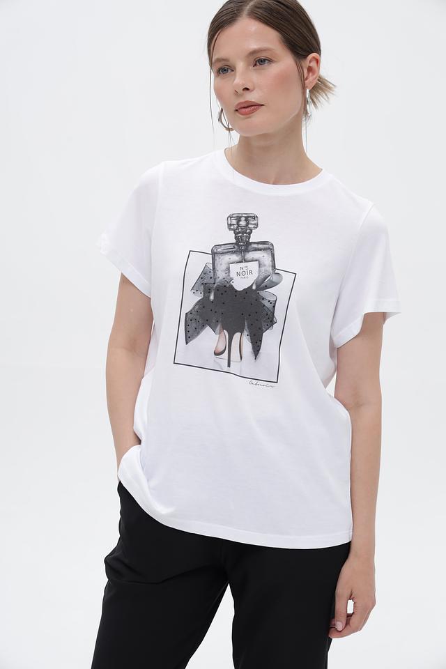 Футболка украшена оригинальным графичным принтом в виде флакона духов, выполненным в черно-серых тонах. Принт придает образу изысканность и современность.
