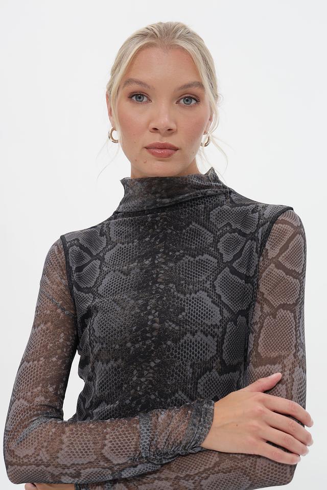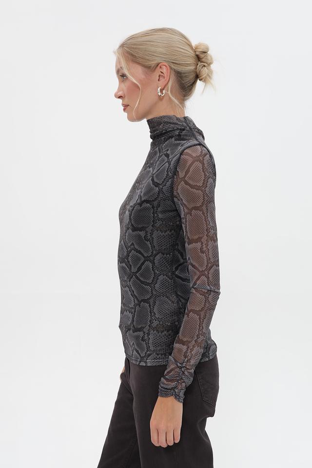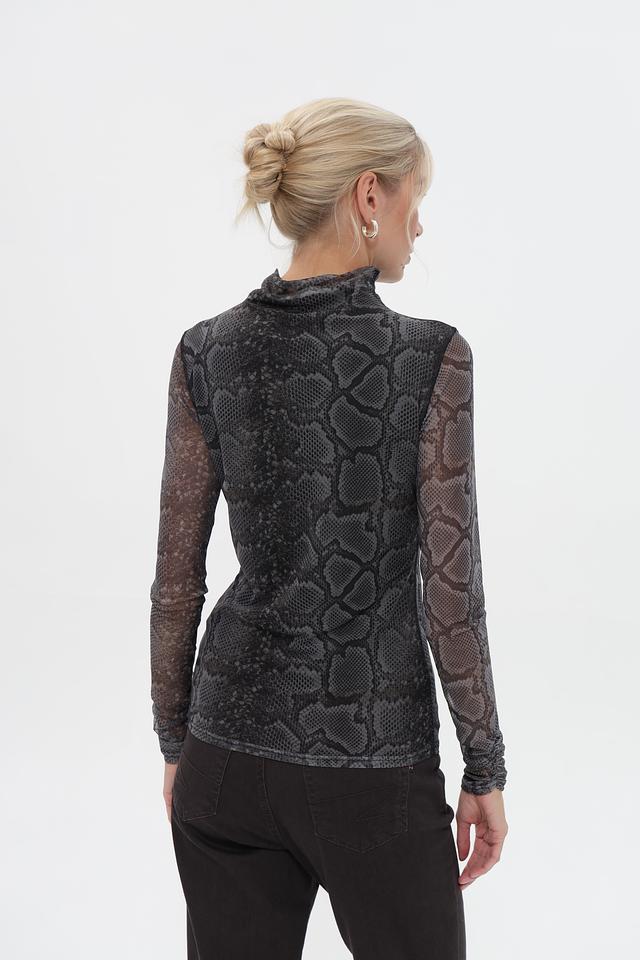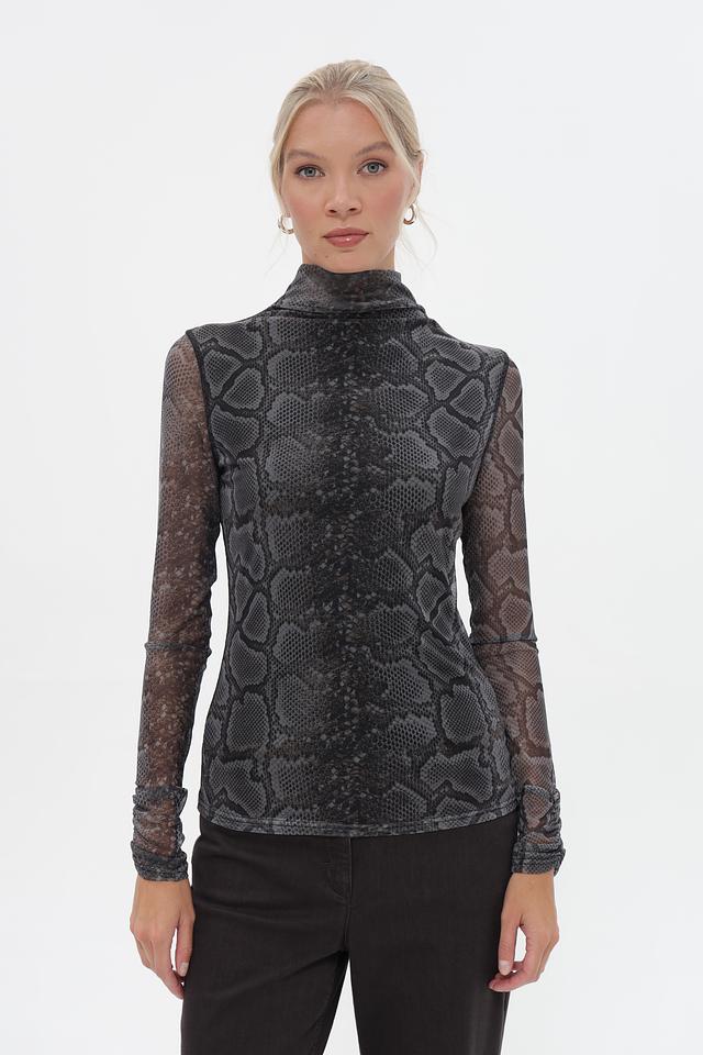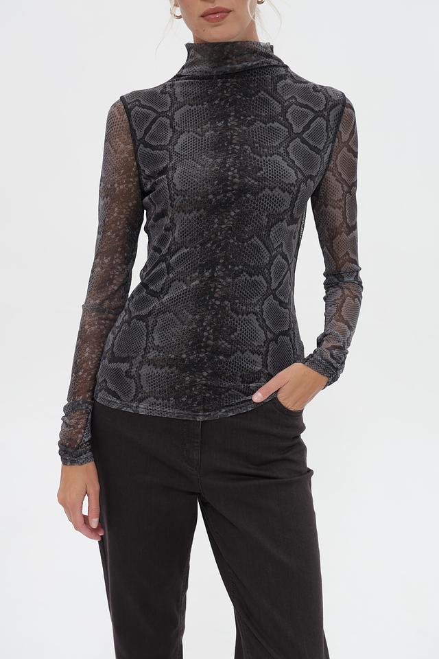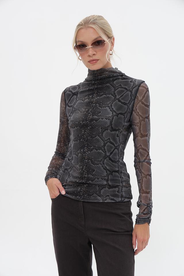 Эта блузка от Catnoir станет ярким акцентом вашего гардероба. Выполнена в чёрном цвете с оригинальным принтом, имитирующим кожу рептилии.