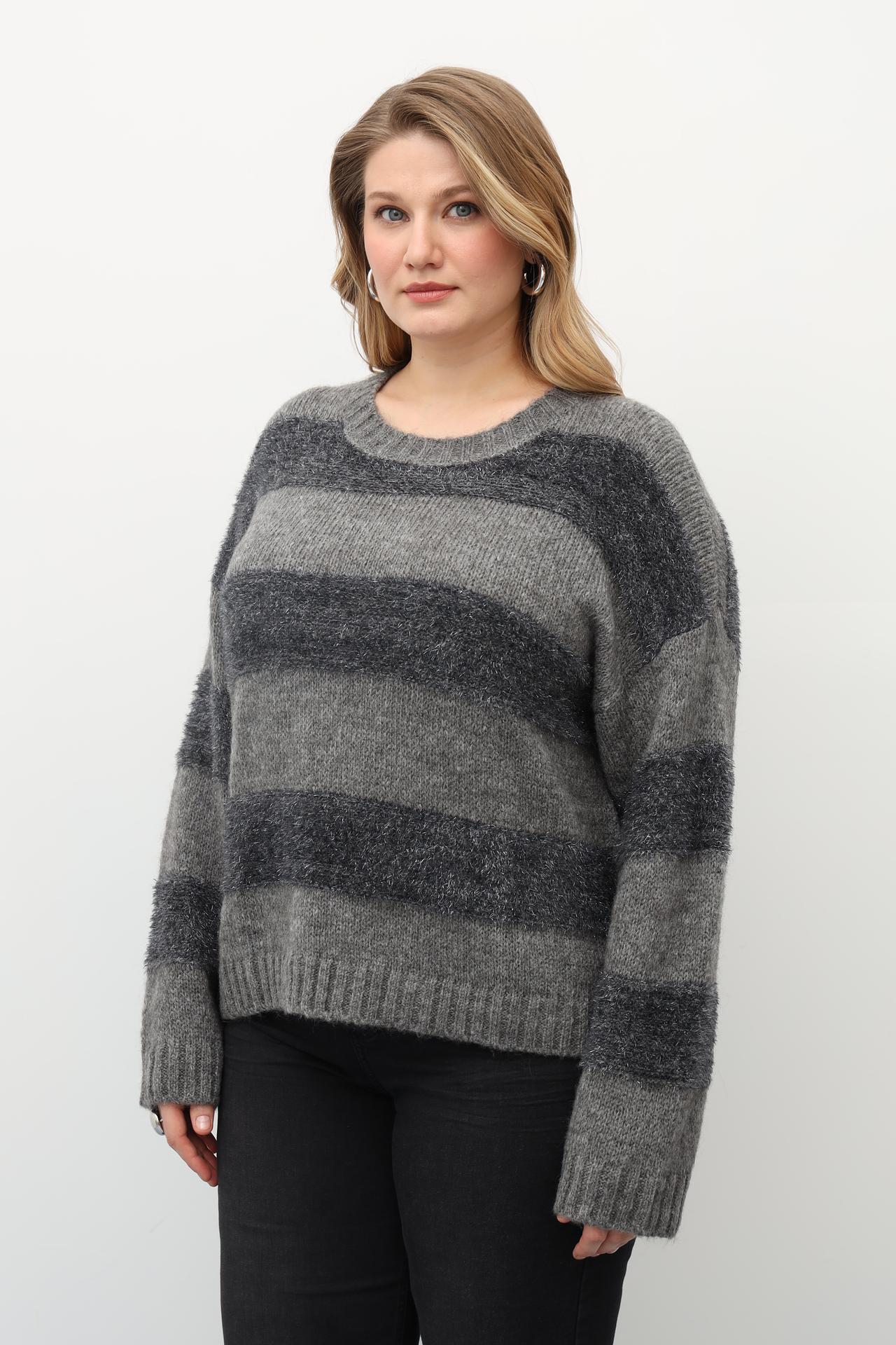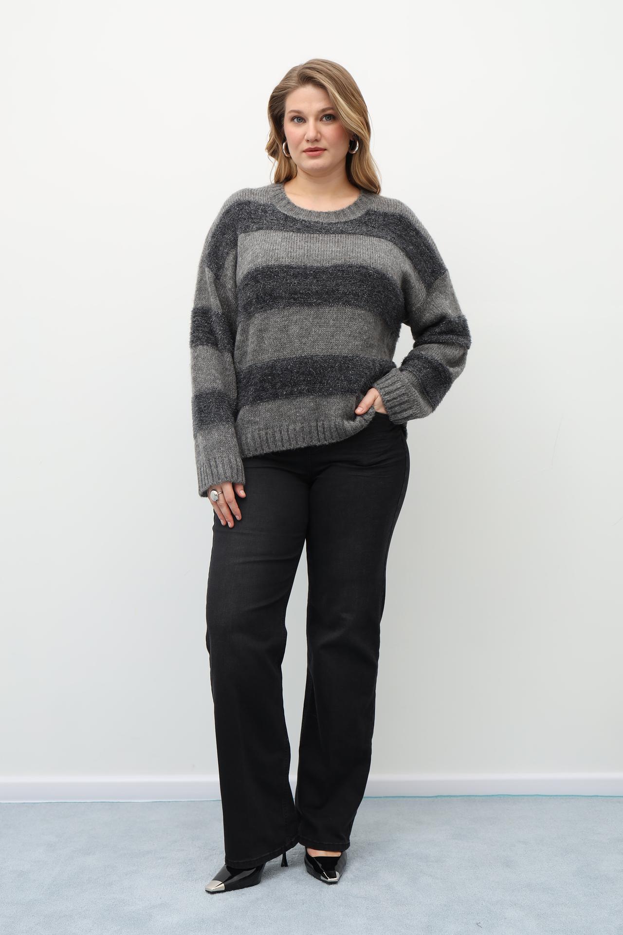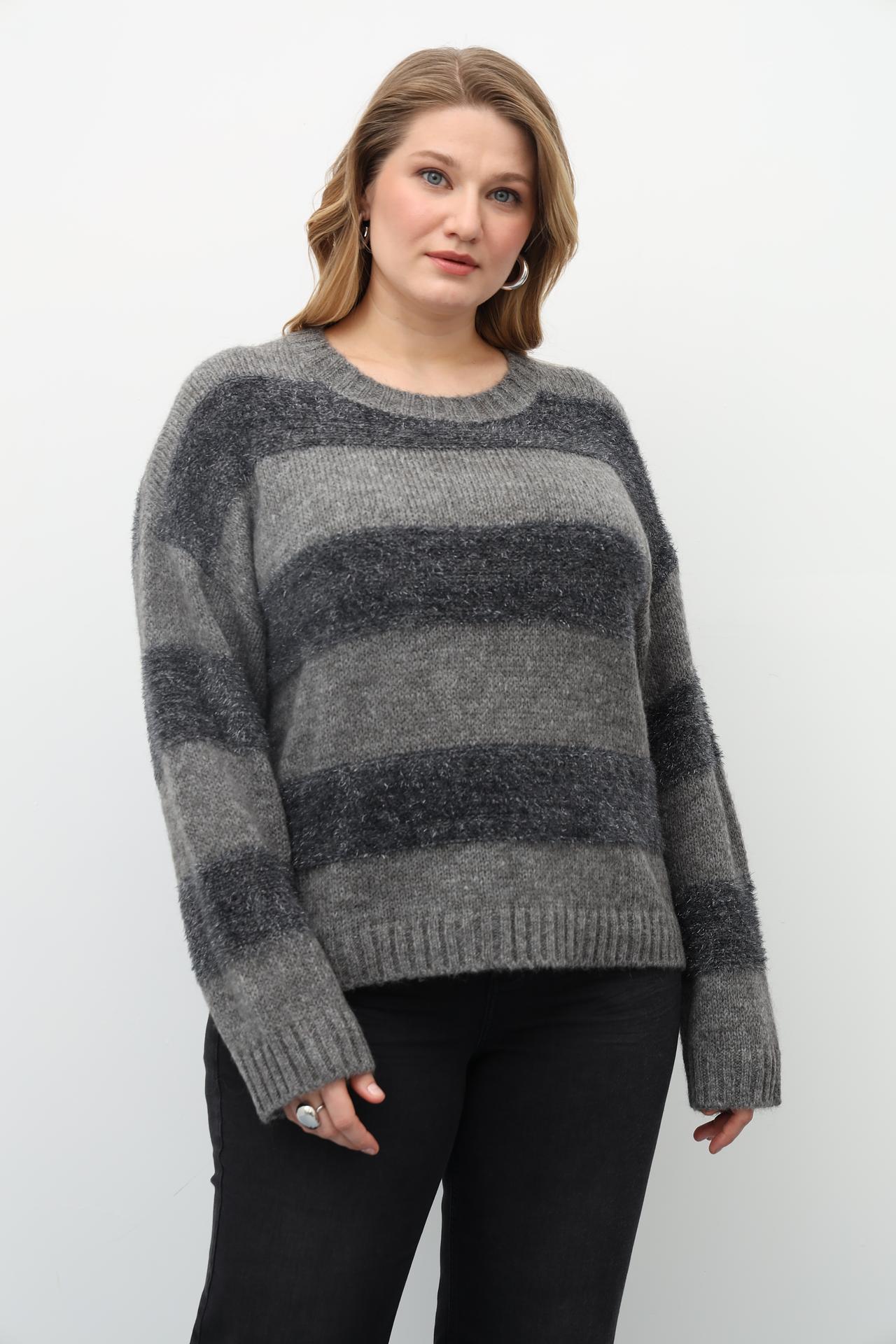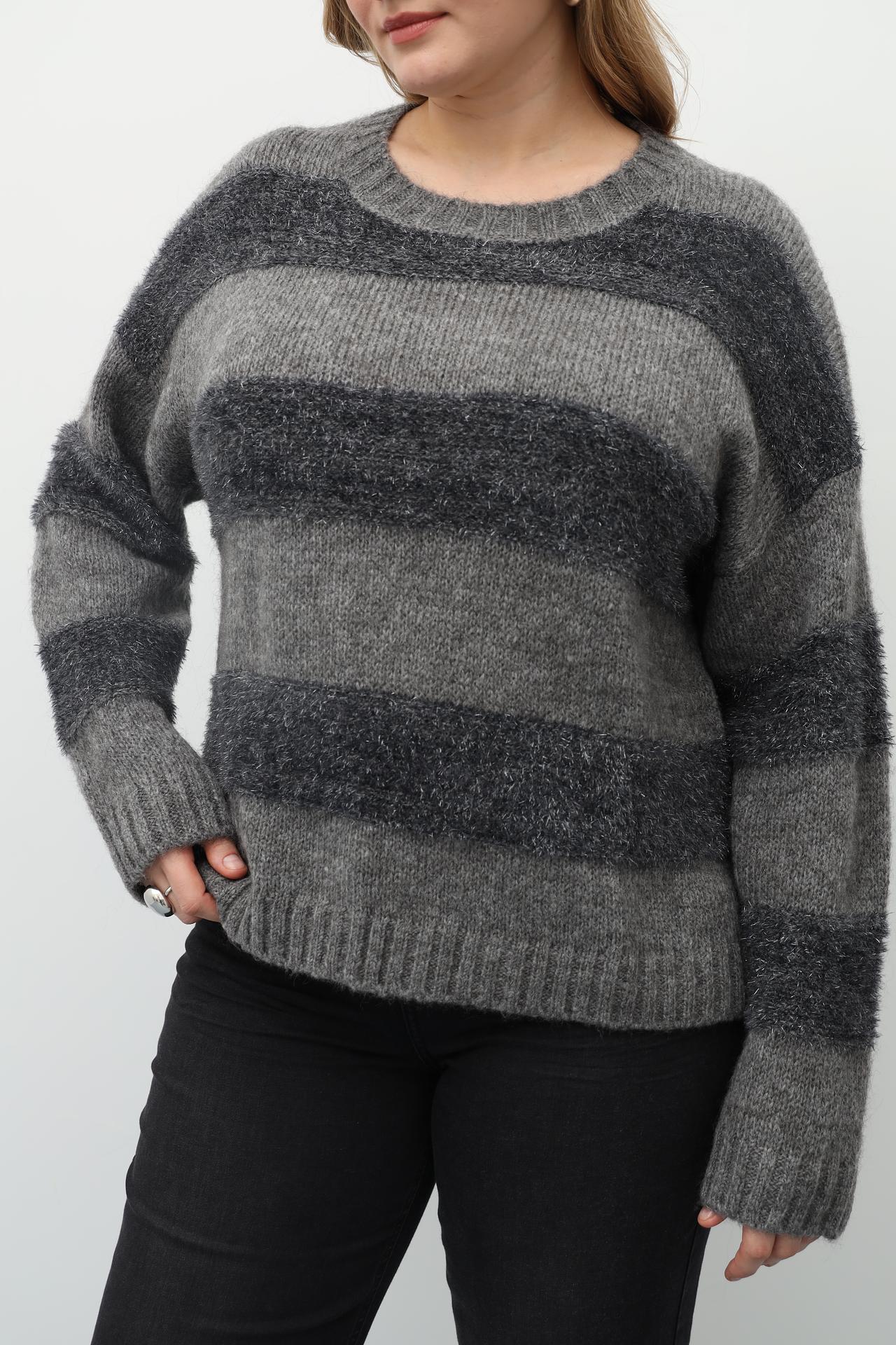 - Дизайн: Классический крой с круглым вырезом и длинными рукавами. Горизонтальные полосы в двух оттенках серого создают стильный и современный вид.