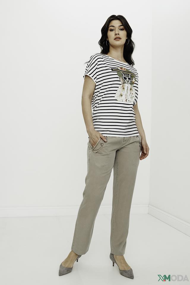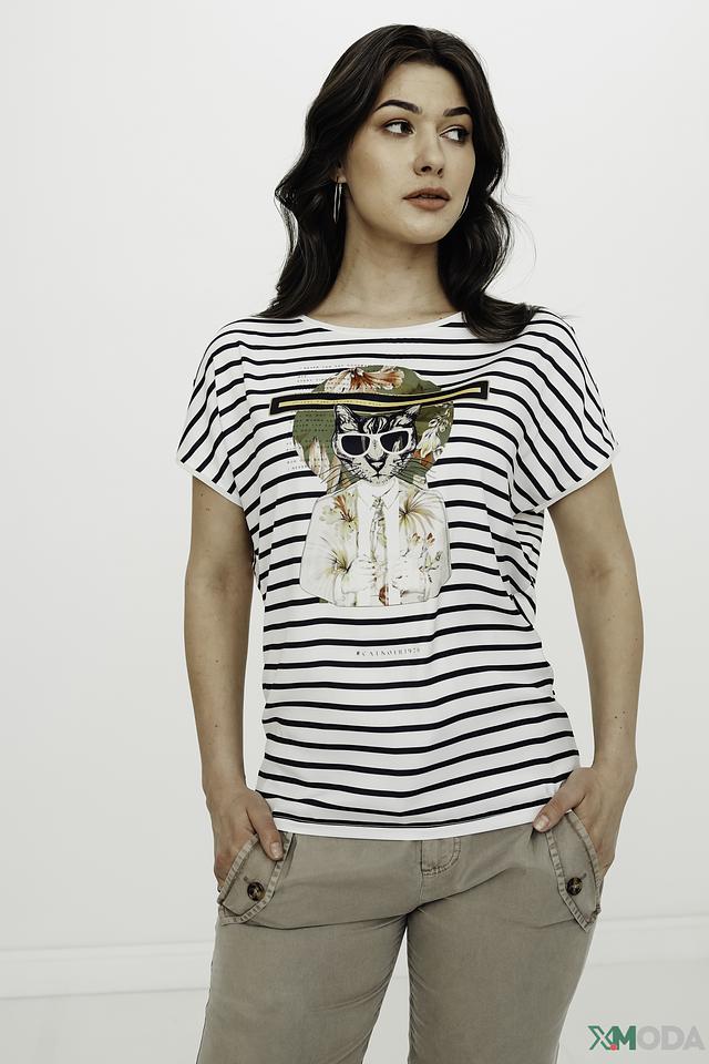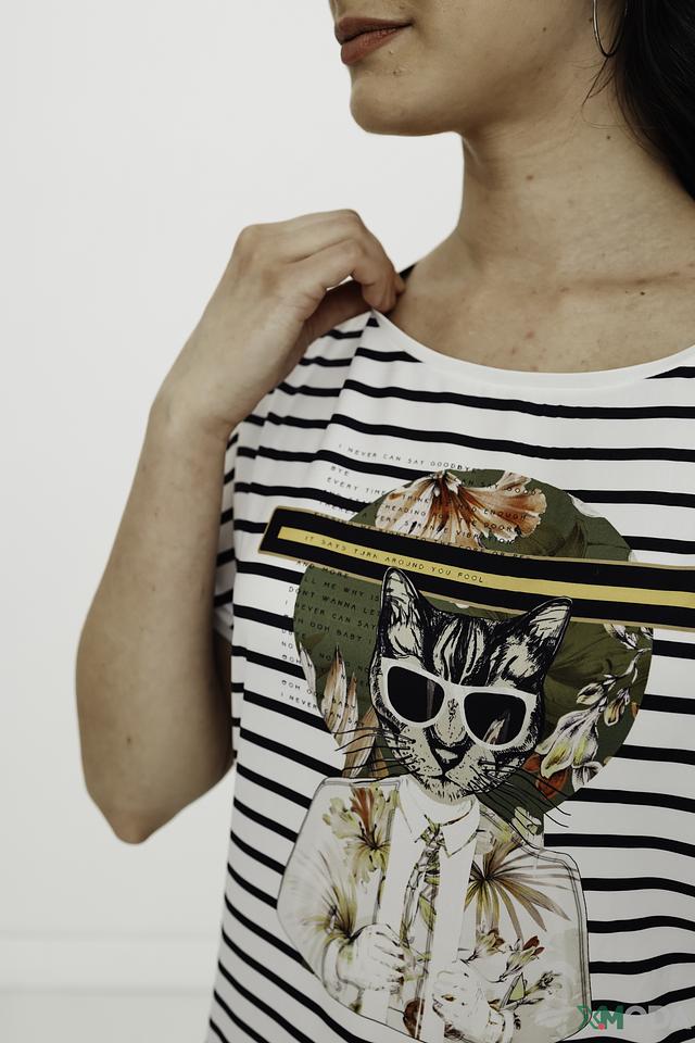 Основным акцентом футболки является яркий принт с изображением кошки в шляпе и солнцезащитных очках, который придаёт ей игривый и запоминающийся вид. Футболка выполнена из высококачественного модала (95%) с добавлением эластана (5%), что обеспечивает мягкость, комфорт и хорошую посадку по фигуре.
