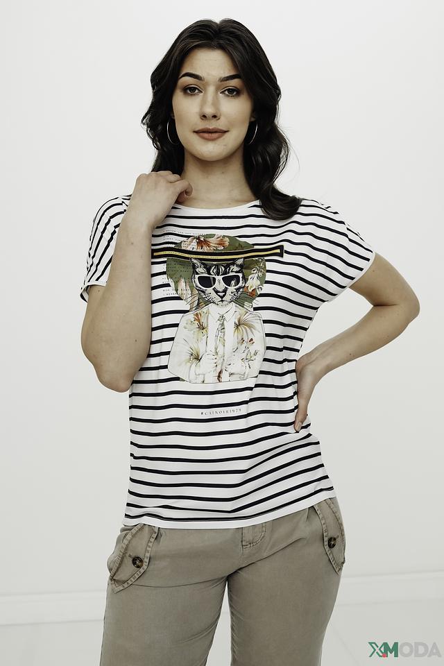 Женская футболка Catnoir чёрно-белого цвета с ярким принтом кошки в шляпе. Изготовлена из мягкого и приятного к телу модала с добавлением эластана для комфортной посадки. Состав: модал 95%, эластан 5%