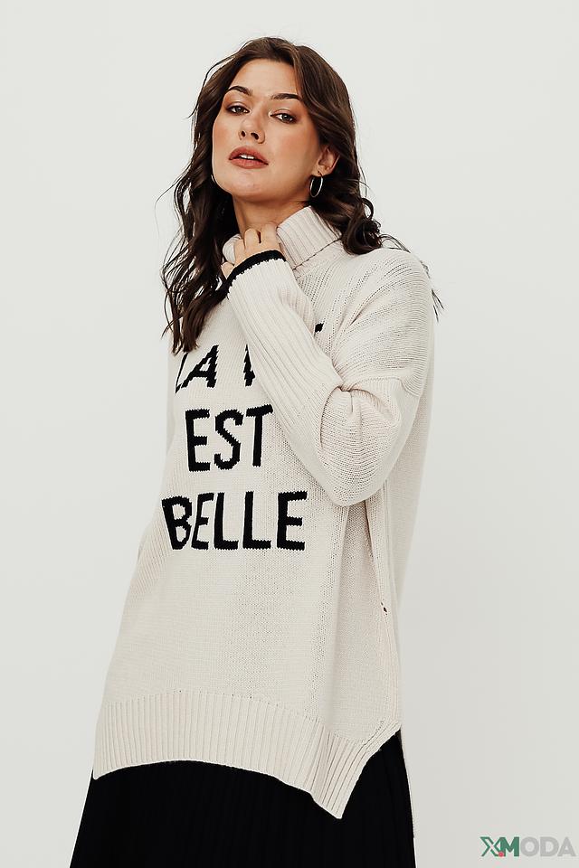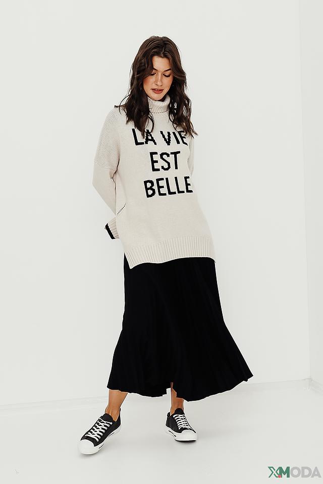Пуловер имеет высокий воротник и свободный крой, что обеспечивает свободу движений. На лицевой стороне пуловера расположена надпись "La Vie Est Belle" чёрного цвета, которая добавляет образу оригинальности и стиля.