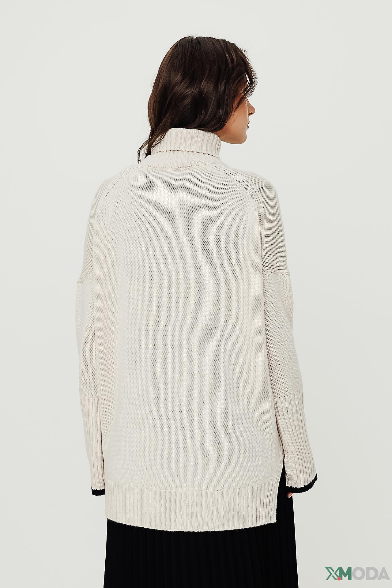 - Стильный дизайн: Оригинальная контрастная надпись «LA VIE EST BELLE» на бежевом фоне придает изделию индивидуальность и современный акцент. Высокий воротник, спущенная линия плеча и асимметричный низ с разрезами подчеркивают актуальность модели и делают этот женский пуловер модным решением.