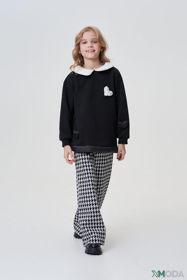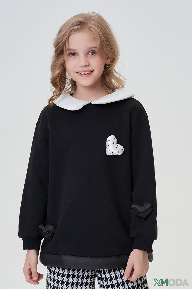 - Дизайн и декор: Классический черный цвет джемпера дополнен контрастным белым воротником и изящными аппликациями в виде сердец на груди и рукавах. Белый отложной воротник придает образу элегантность, а сердечки делают его более нежным и детским.