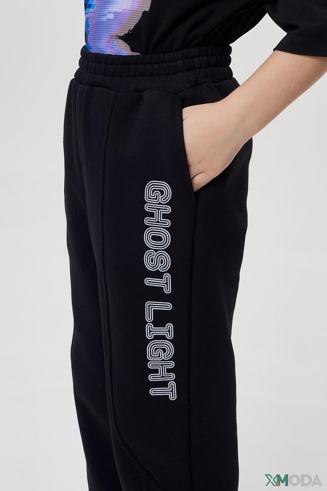Брюки изготовлены из высококачественного хлопка (85%) с добавлением полиэстера (15%), что делает их приятными на ощупь, дышащими и износостойкими. По боковой части брюк расположена яркая надпись "GHOST LIGHT", выполненная в контрастном цвете, что придает им современный и стильный вид.