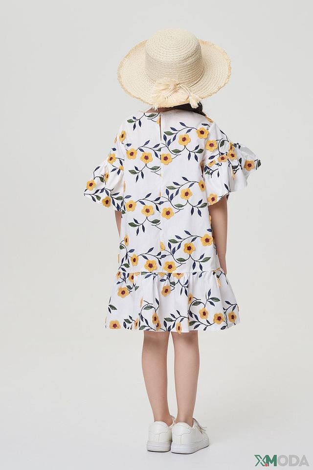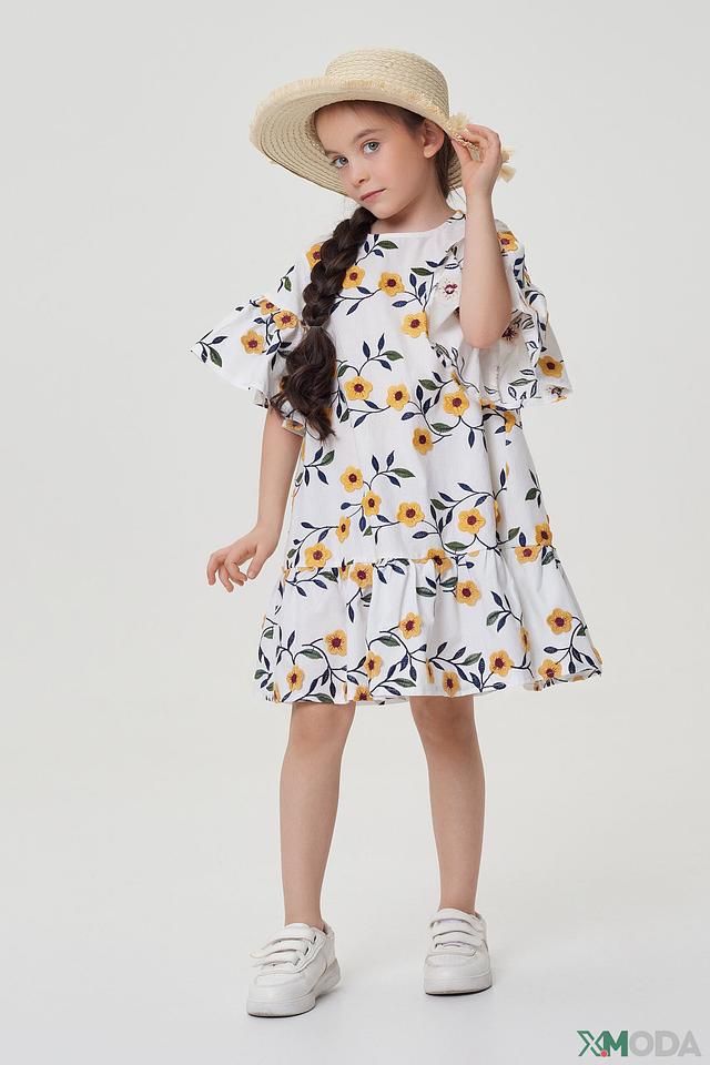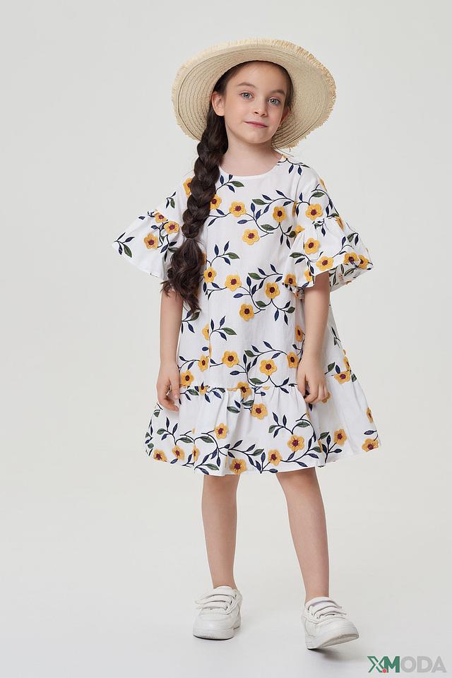 Модель имеет свободный крой, не сковывающий движений, и короткие рукава с воланами, придающими образу игривость. Юбка платья собрана на мягкую резинку, обеспечивая комфортную посадку. Платье изготовлено из 100% хлопка – натурального, дышащего и приятного к телу материала.