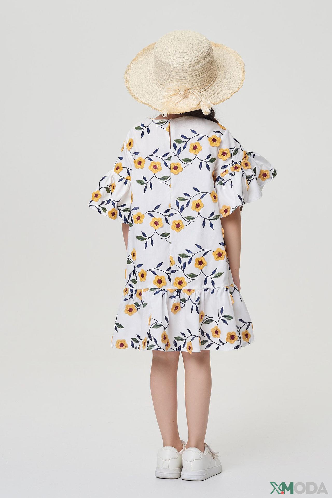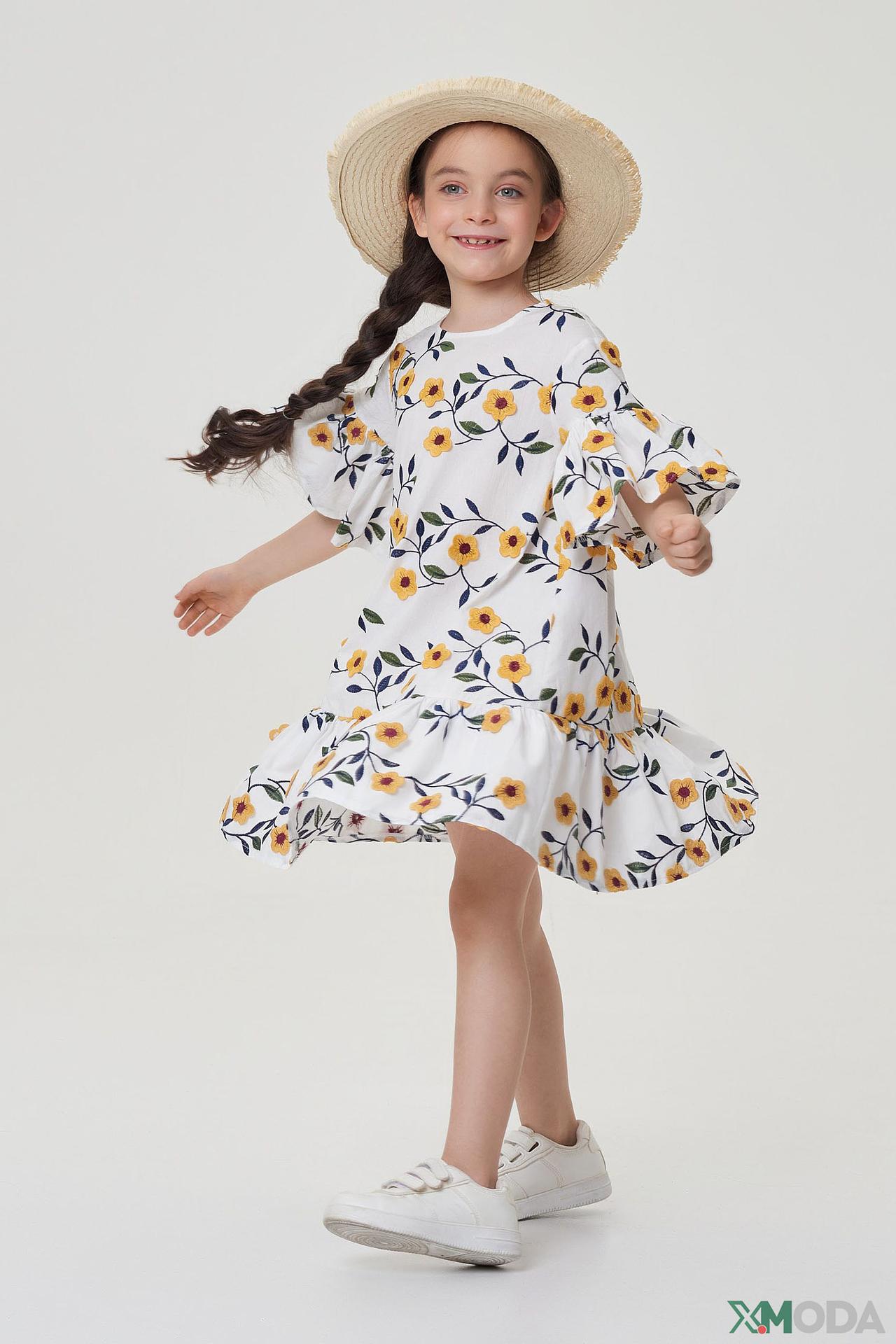 - Яркий цветочный принт: Белая основа платья украшена нежным, но выразительным цветочным узором с жёлтыми бутонами и зелёными ветвями. Такой рисунок создаёт солнечное и радостное настроение, делая образ девочки по-настоящему летним.