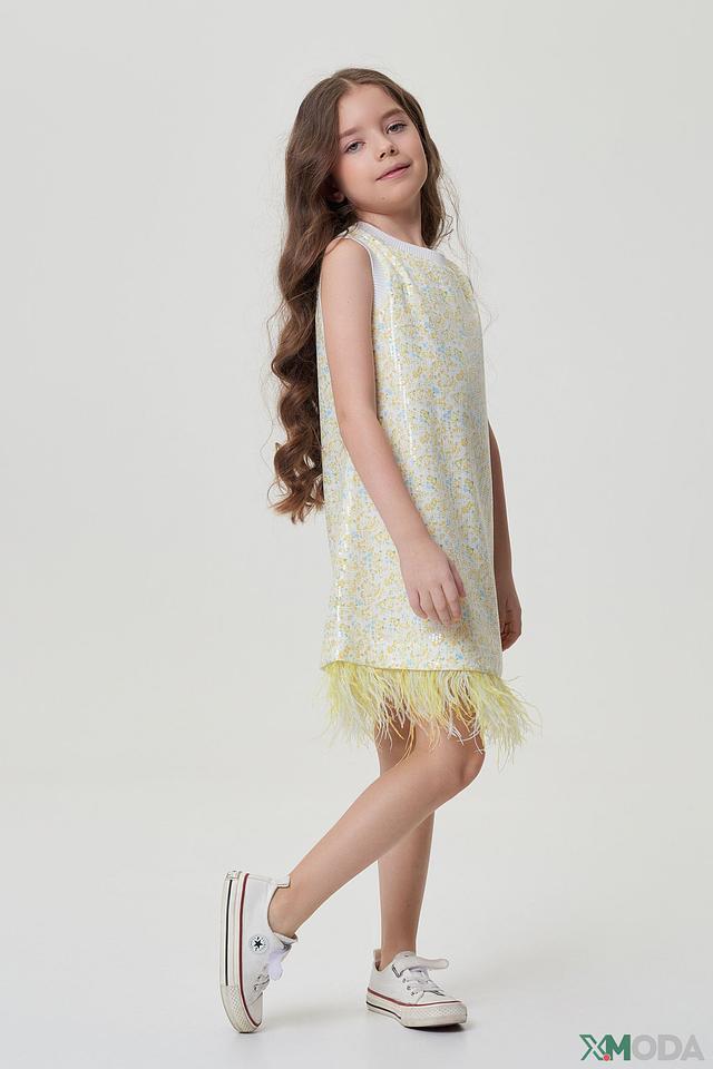 Оригинальный дизайн платья подчеркнет индивидуальность ребенка. Яркие пайетки и воздушные перья создают неповторимый образ, подходящий для торжественных мероприятий или фотосессий.